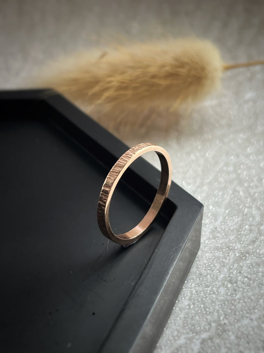 Solid 9ct Rose gold 2mm tree bark textured hammered delicate recycled gold flat band ring