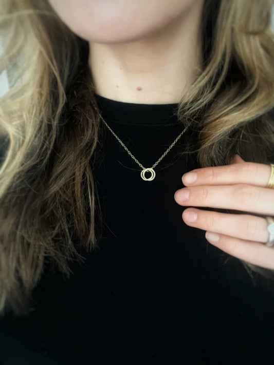 Solid 9ct gold interlocking hoop pendant, a handmade hammered double textured necklace- 9mm