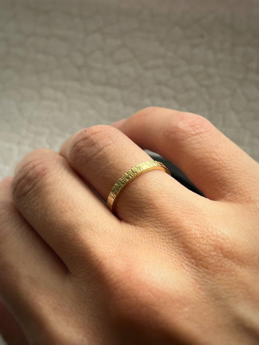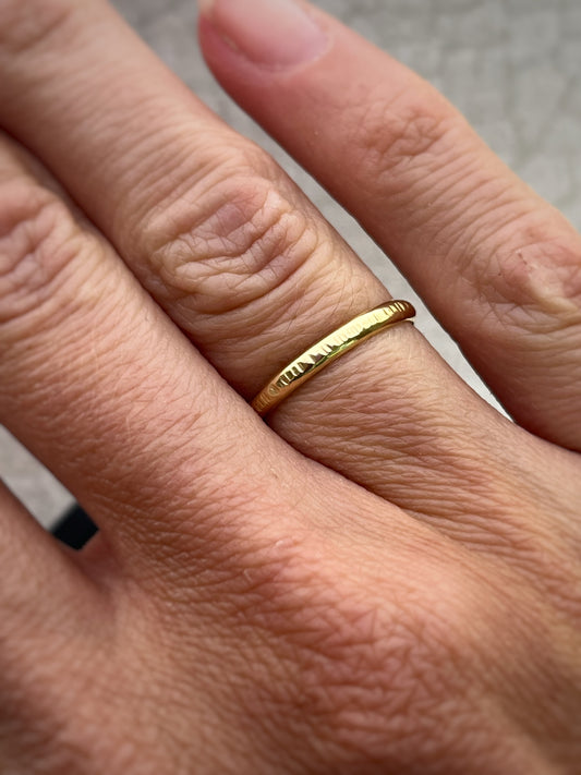 Solid 18ct yellow gold 2mm tree bark textured hammered delicate recycled gold flat band ring