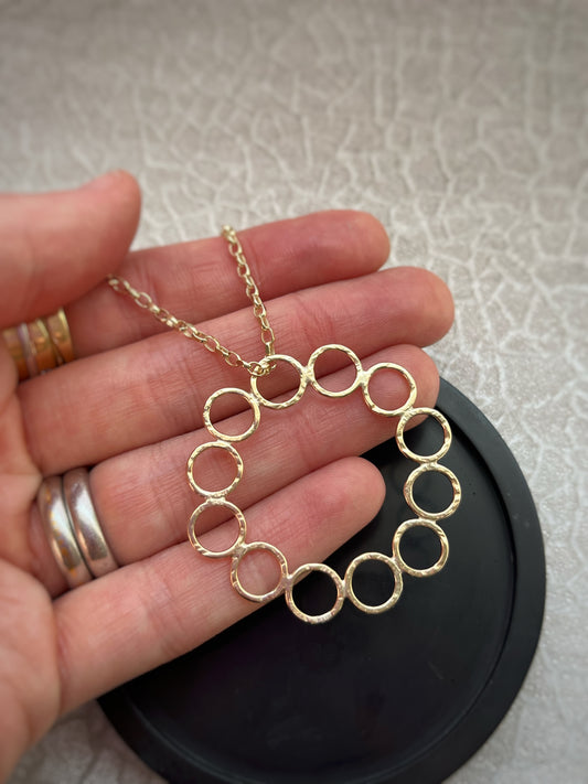 Solid 9ct gold 12 hoop statement circle pendant, a handmade hammered textured necklace