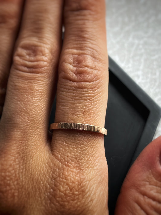 Solid 18ct Rose gold 2mm tree bark textured hammered delicate recycled gold flat band ring