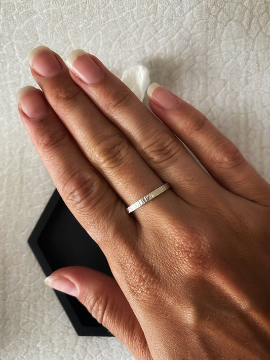 Solid 18ct White gold 2mm tree bark textured hammered delicate recycled gold flat band ring