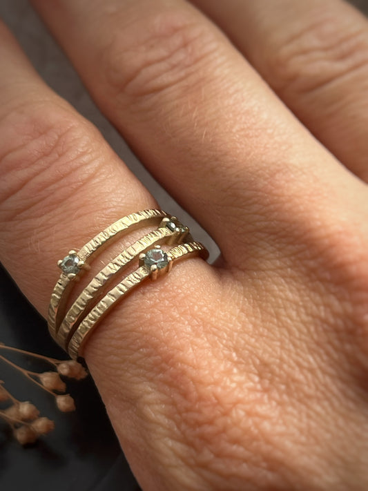 Solid 9ct Recycled Gold & Natural Green Sapphire Triple Band Ring – Handmade, Bark Textured, Hammered Gold Statement Ring