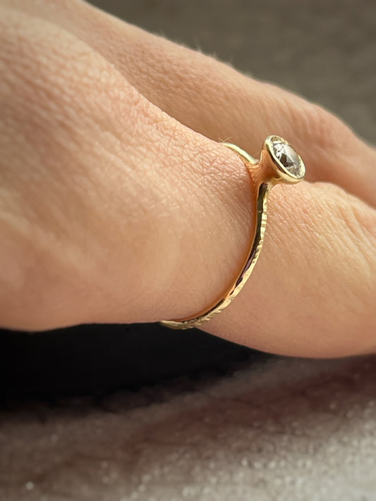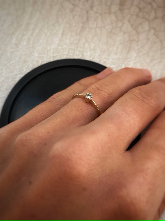 Solid yellow 9ct recycled gold and natural 4mm diamond handmade modern unique delicate dainty engagement ring, hammered tree bark texture