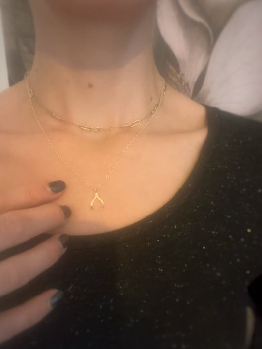 Solid 9ct gold lucky wishbone pendant, a handmade hammered and textured necklace