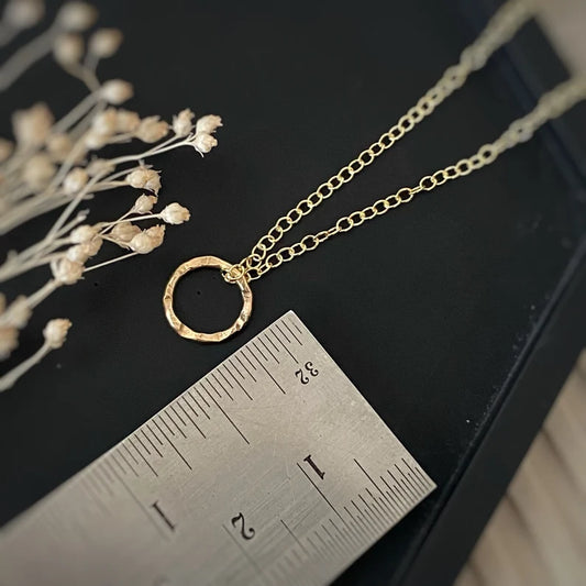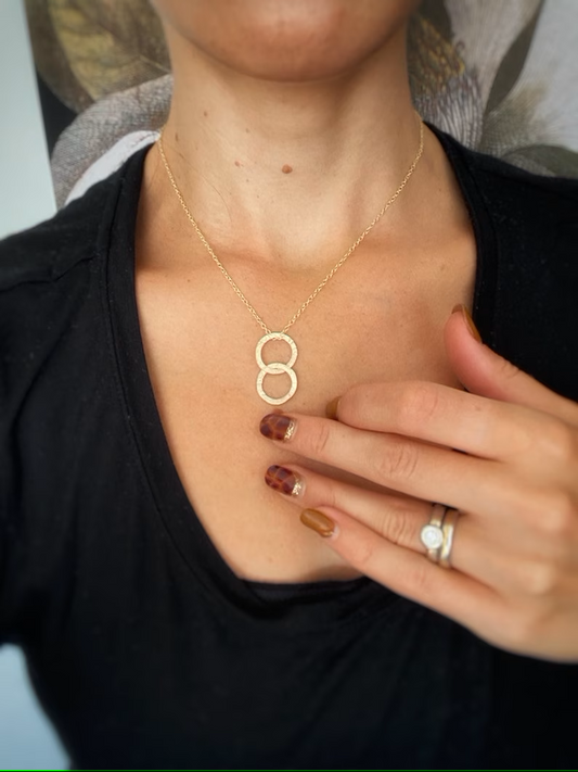 Solid 9ct gold large interlocking circle pendant, a handmade hammered textured necklace