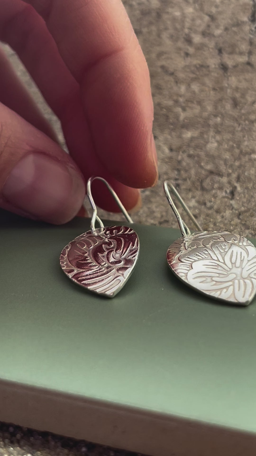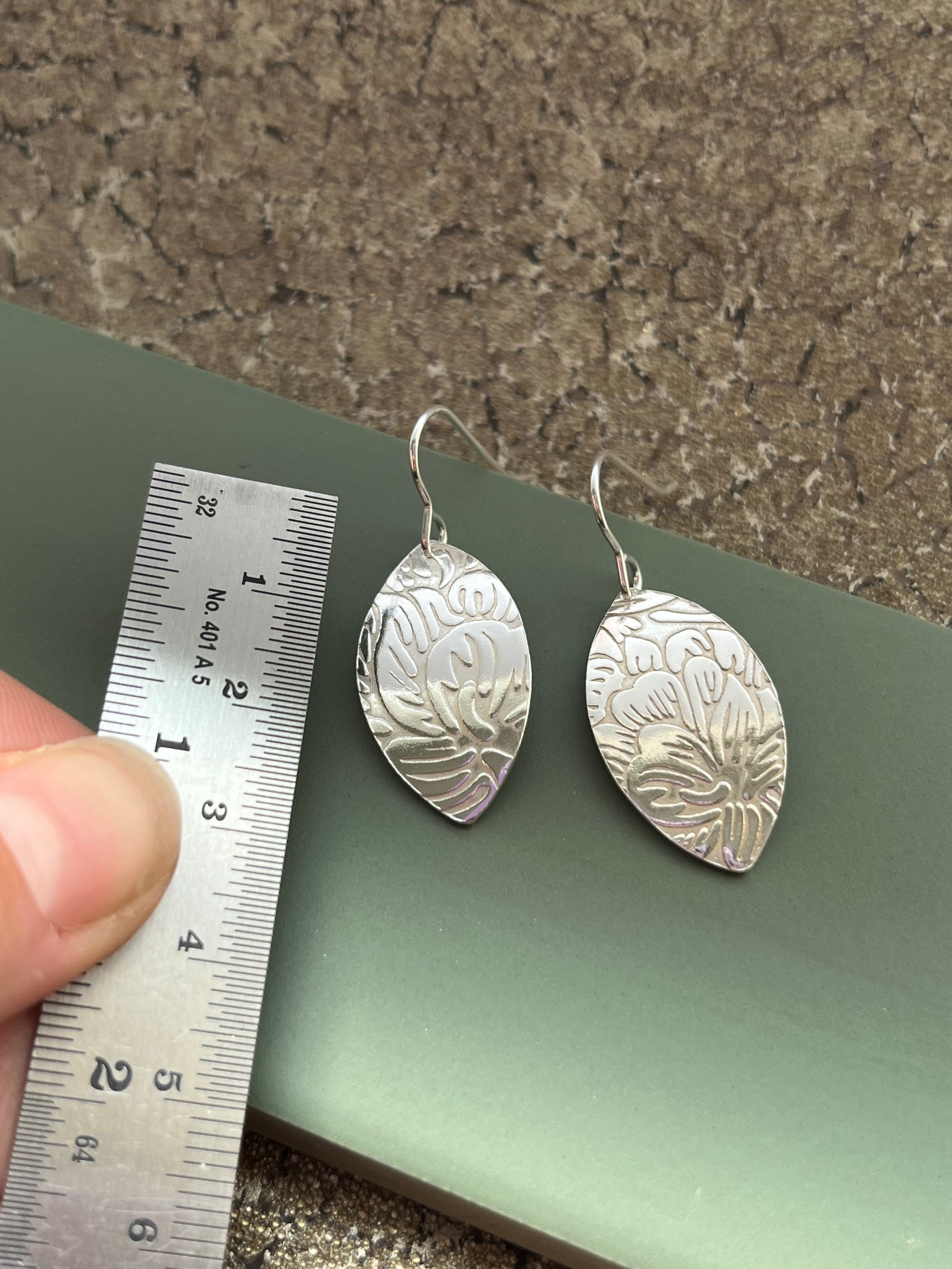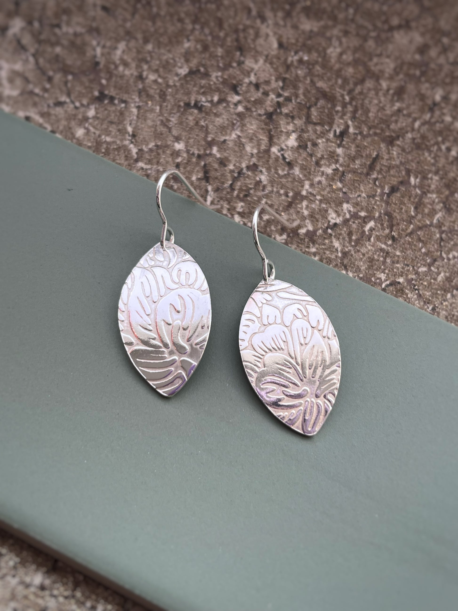 Floral leaf shape sterling silver 26mm x 15mm drop earrings