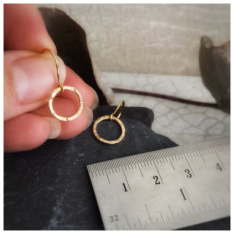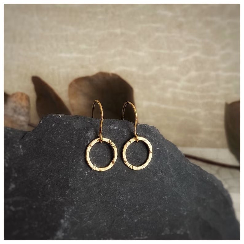 These earrings are Solid 9ct gold, they are round circle drop earring. Handmade hammered texture round dangly yellow gold earrings, Simple modern stylish geometric gold.