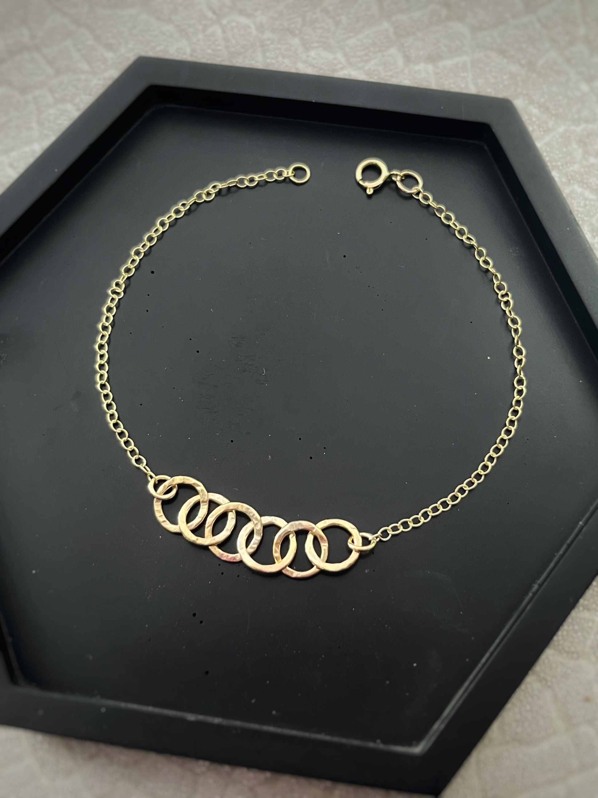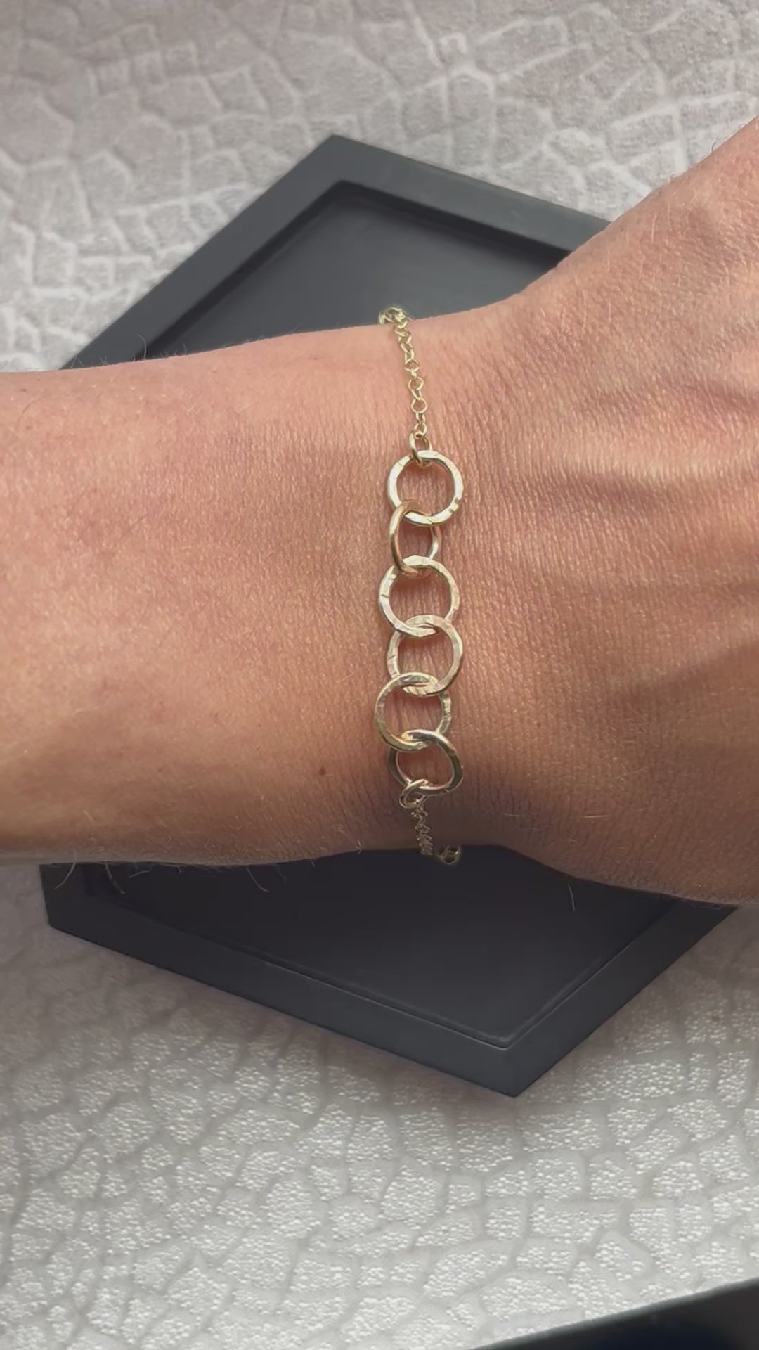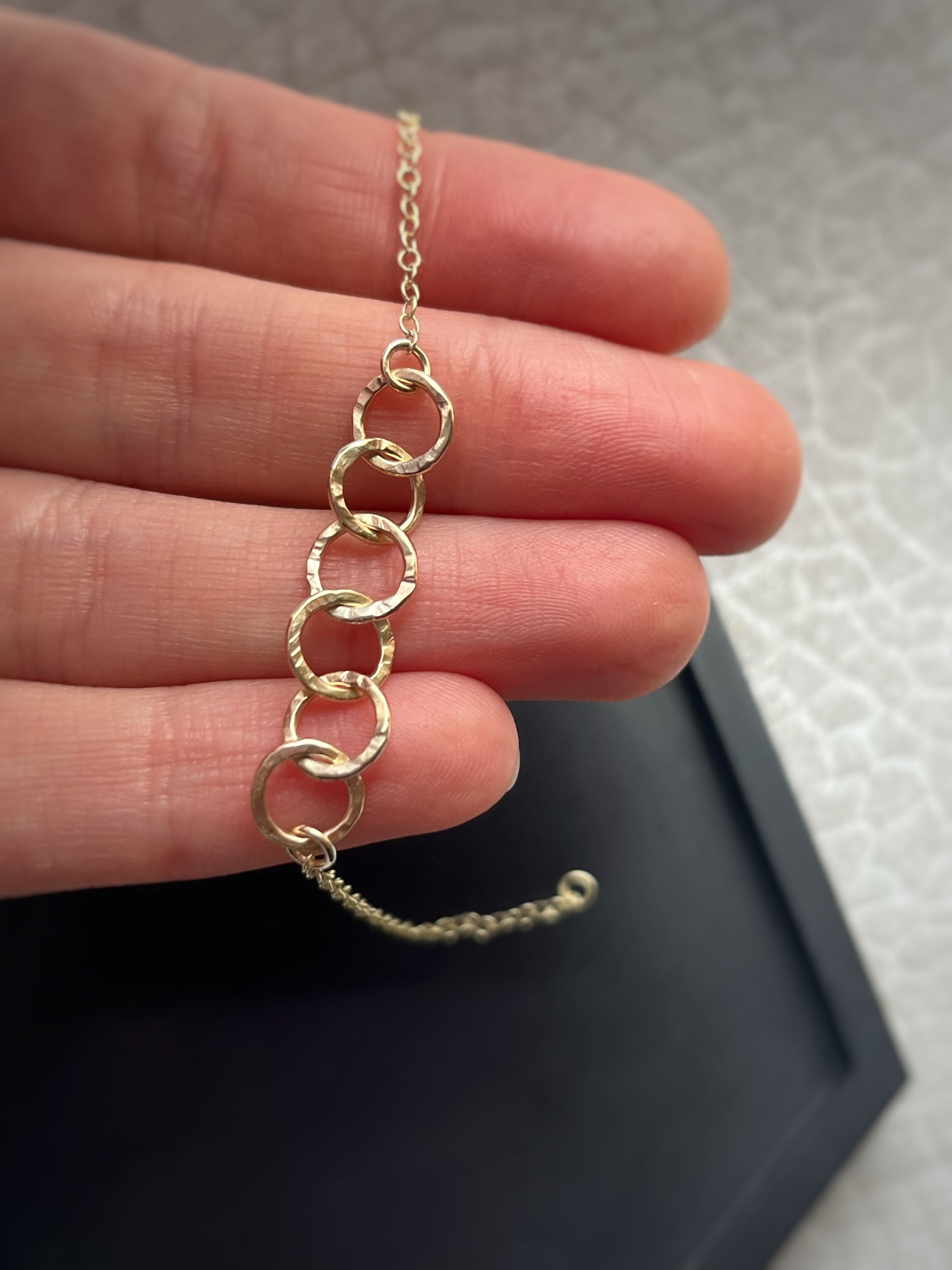 A simple and stunning modern hammered solid 9ct gold 6 simple circle hoop chain bracelet hand made by me. I make every item by hand so each one is completely unique and one of a kind.