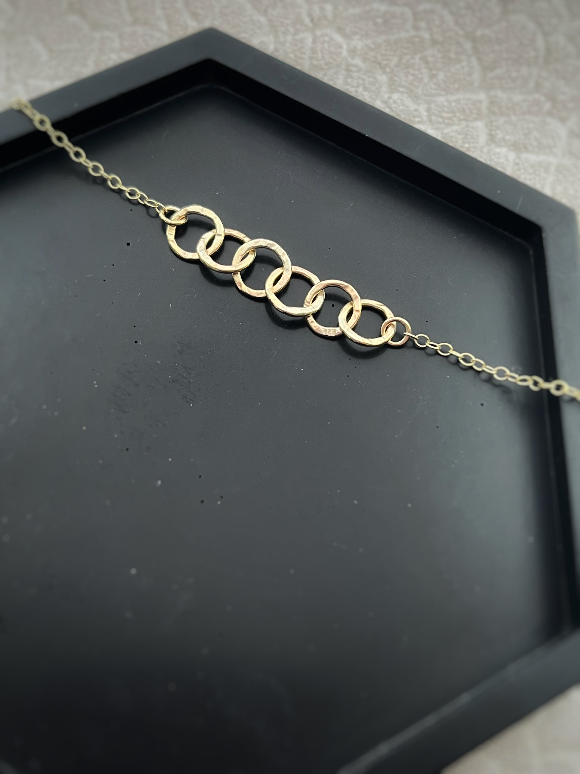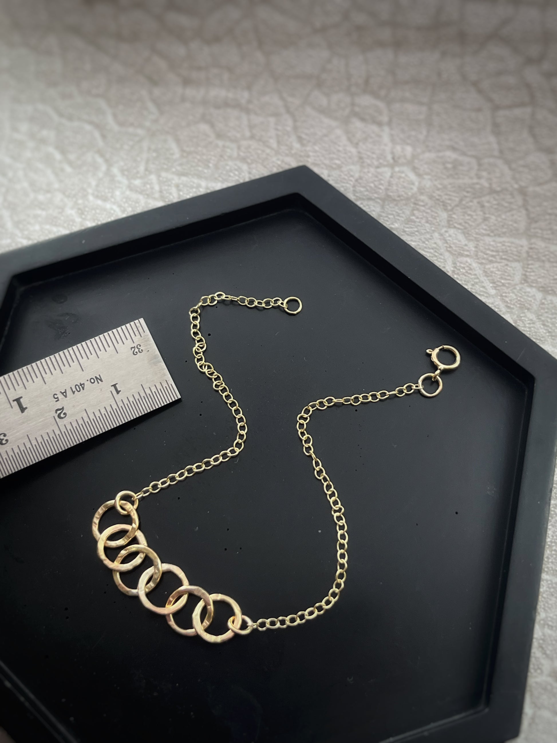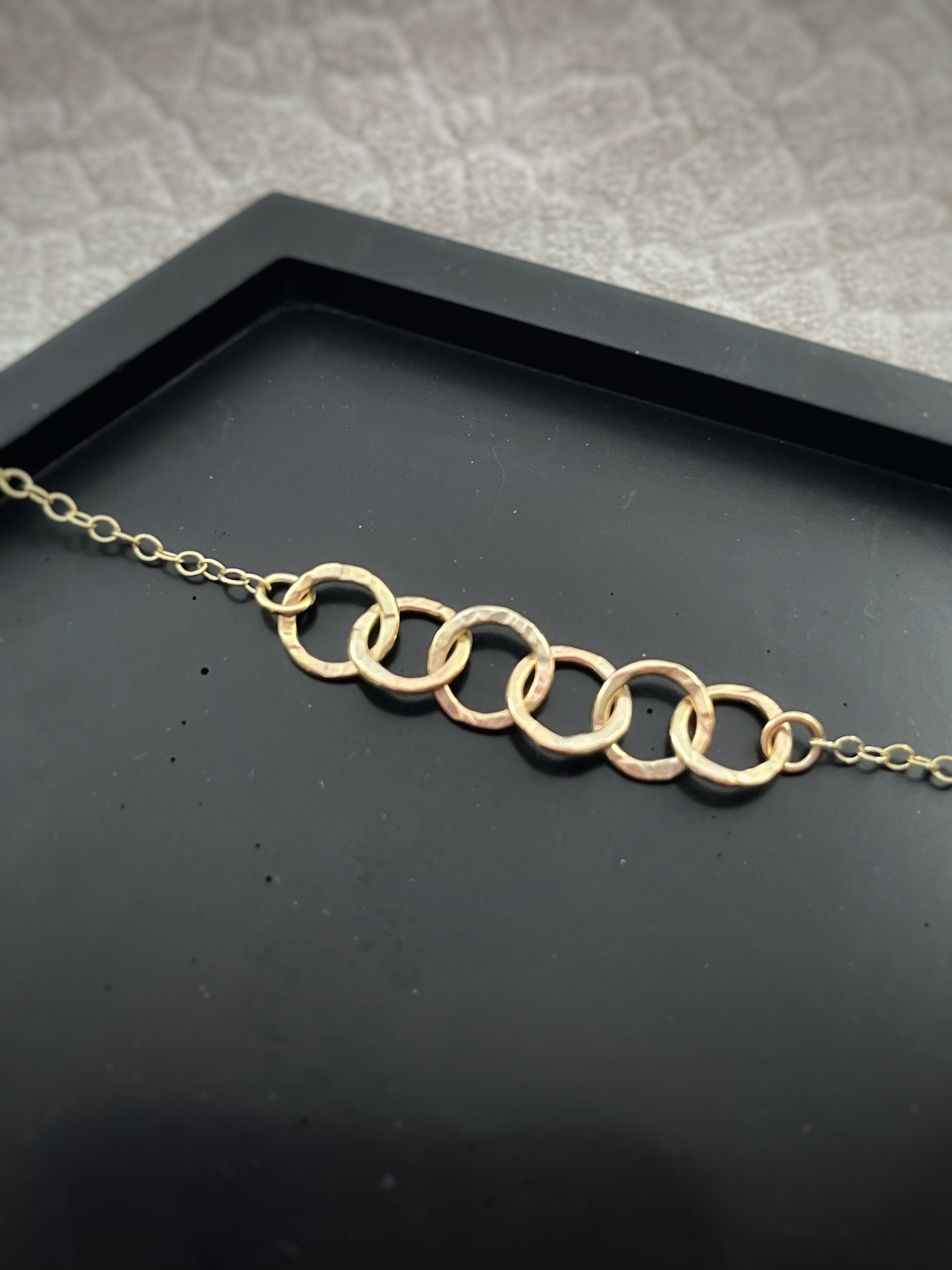 A simple and stunning modern hammered solid 9ct gold 6 simple circle hoop chain bracelet hand made by me. I make every item by hand so each one is completely unique and one of a kind.