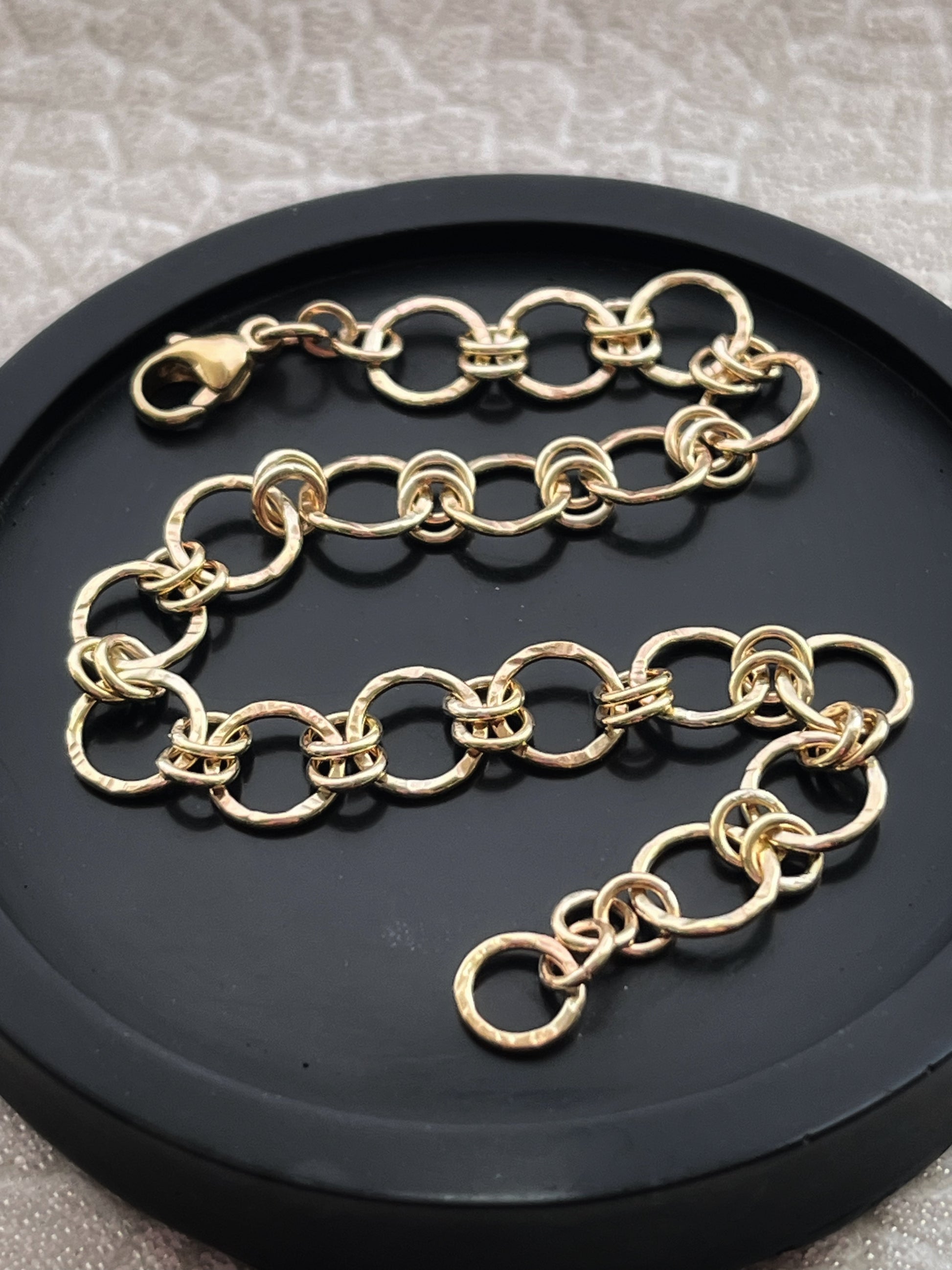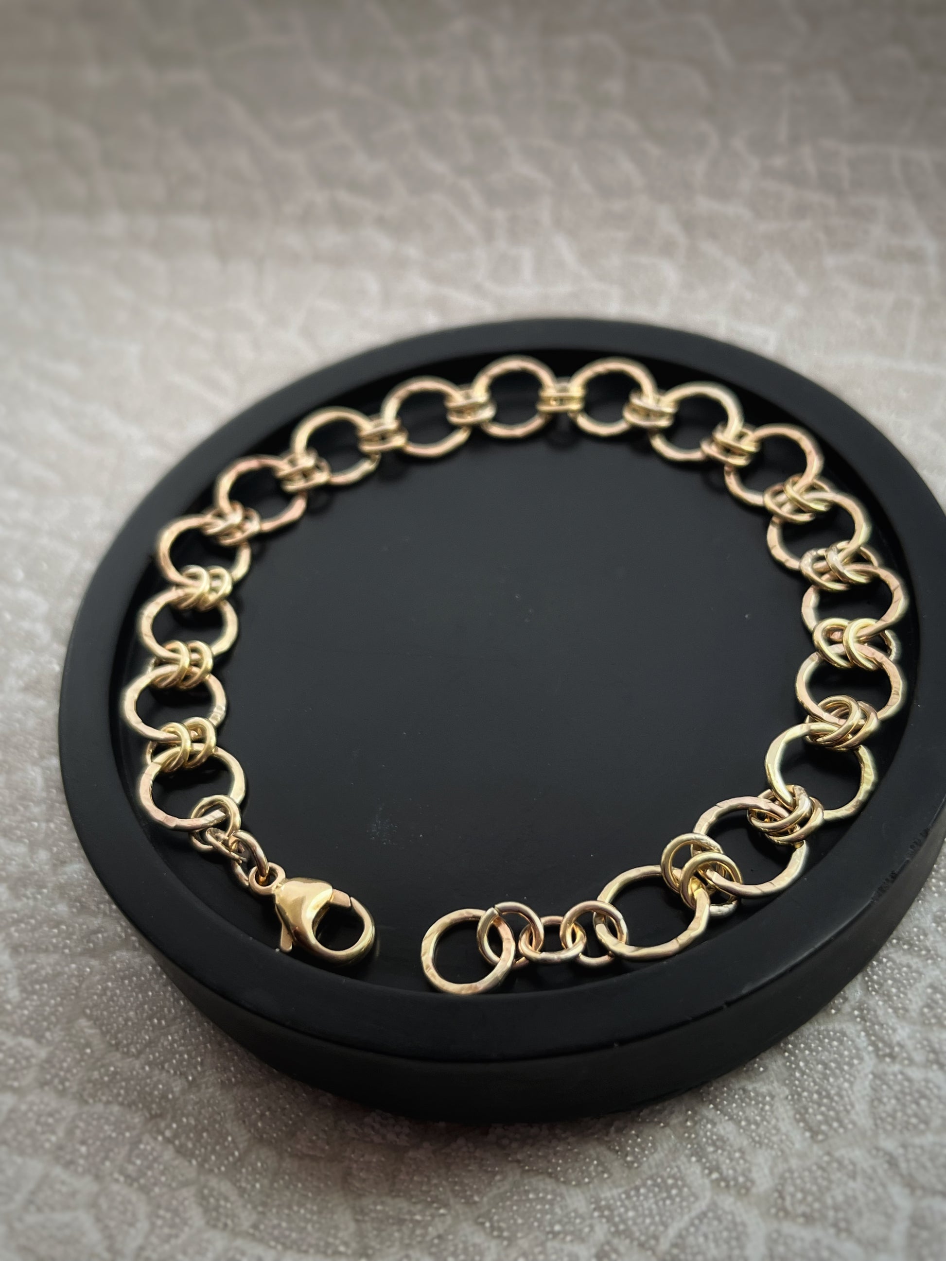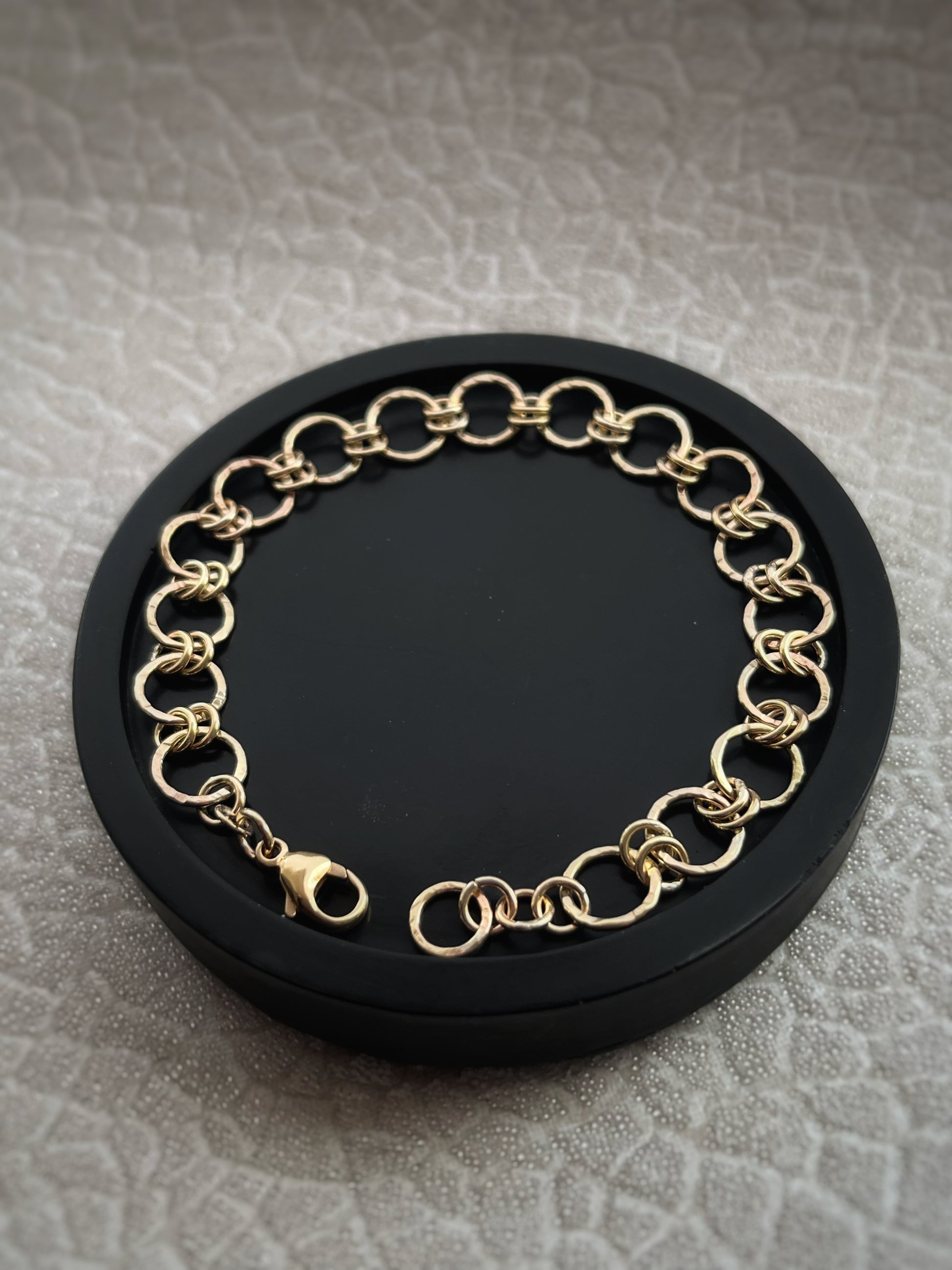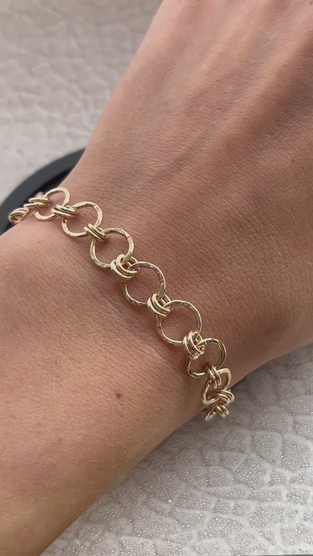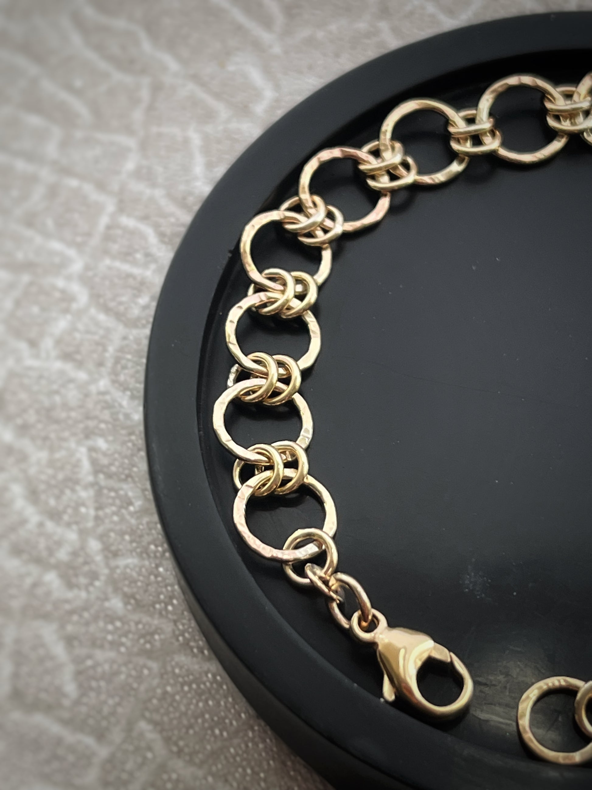 Solid gold interlocking circle bracelet, a handmade hammered textured 9ct solid gold hoop, round modern gold chain bracelet.