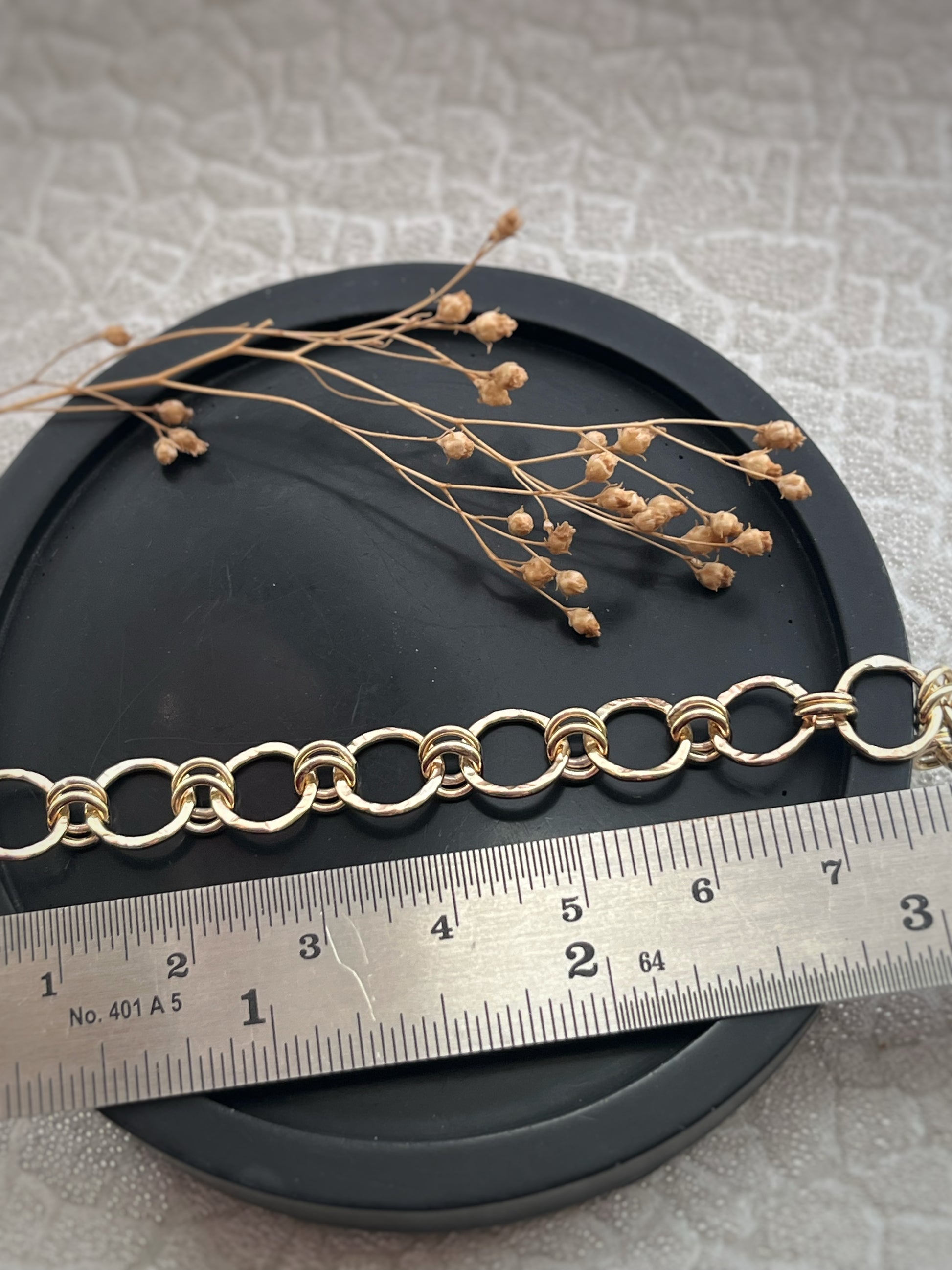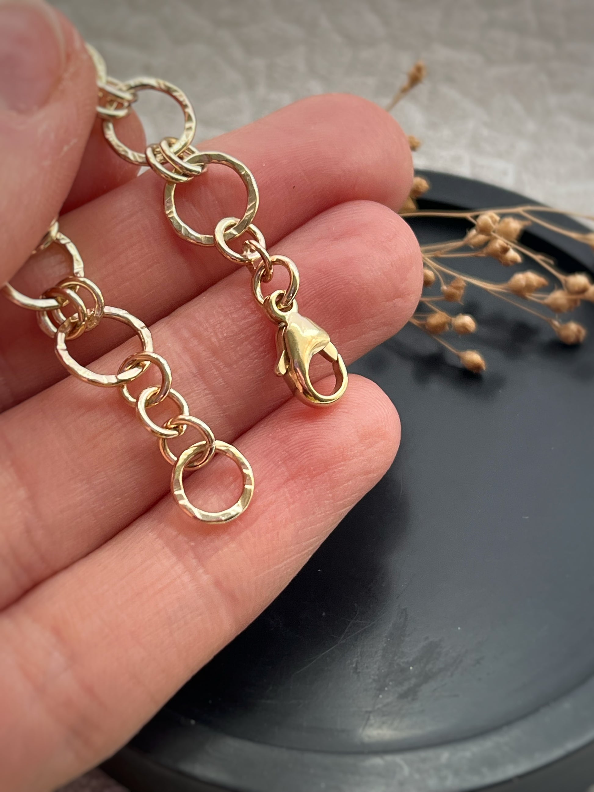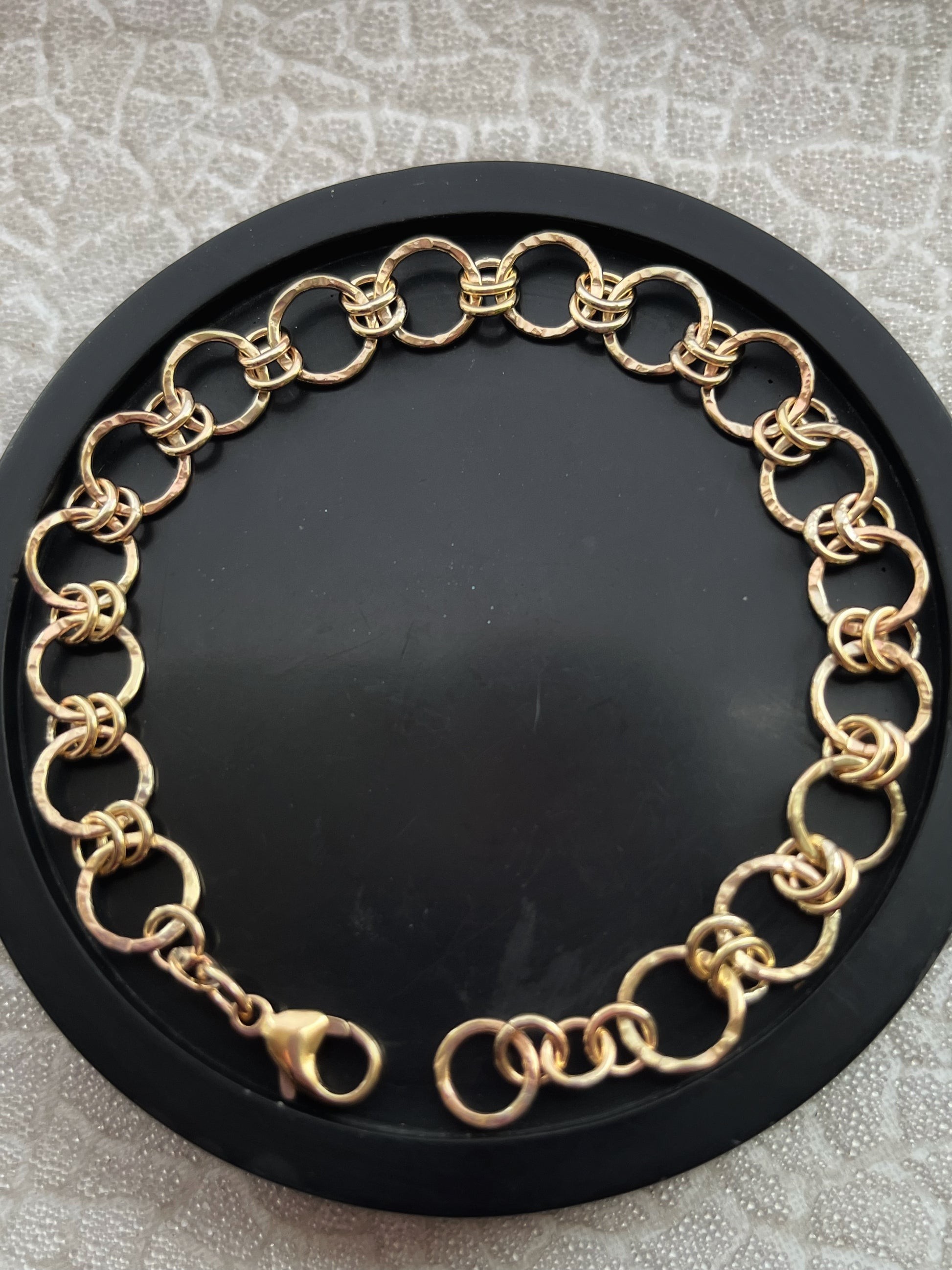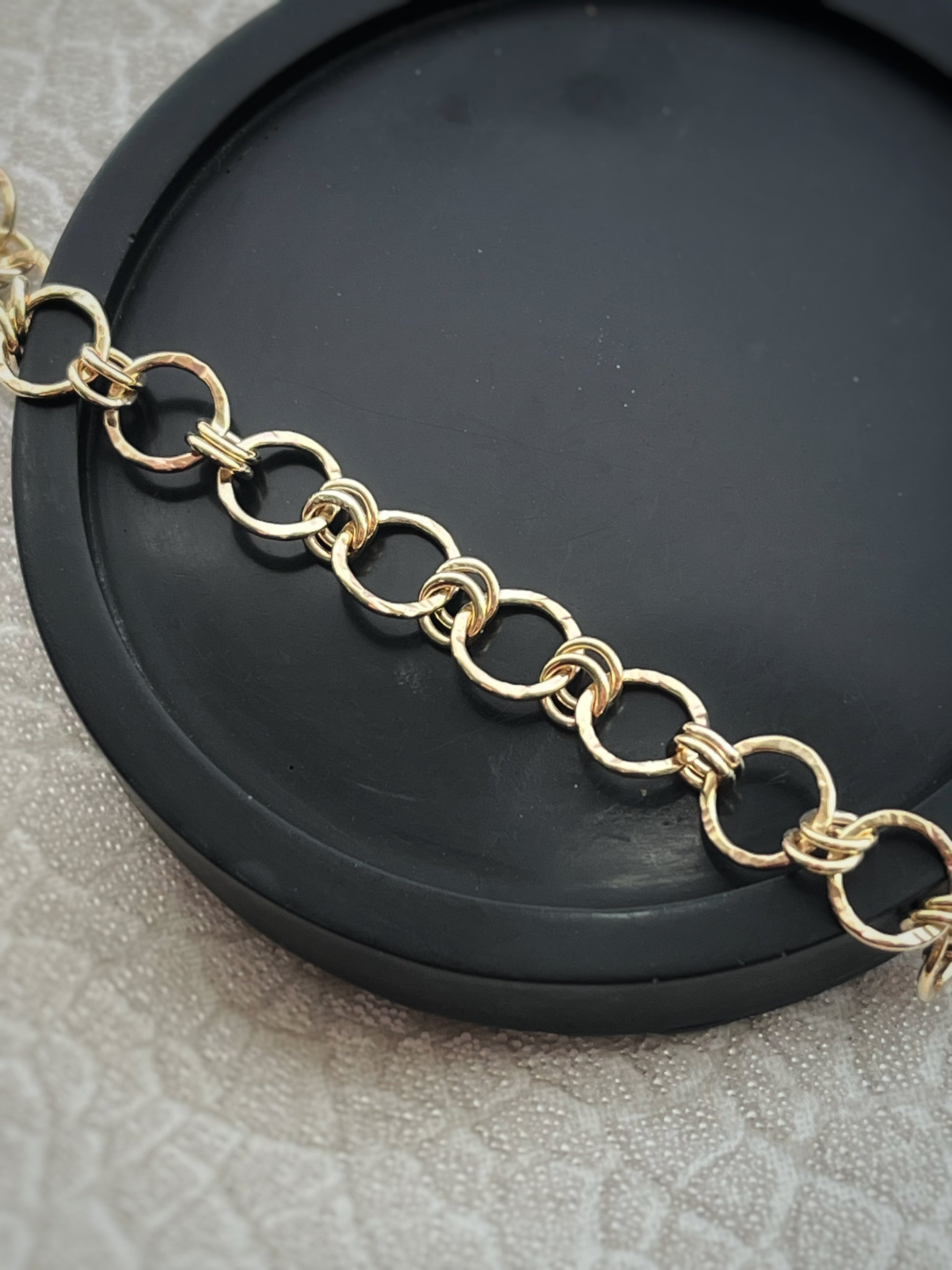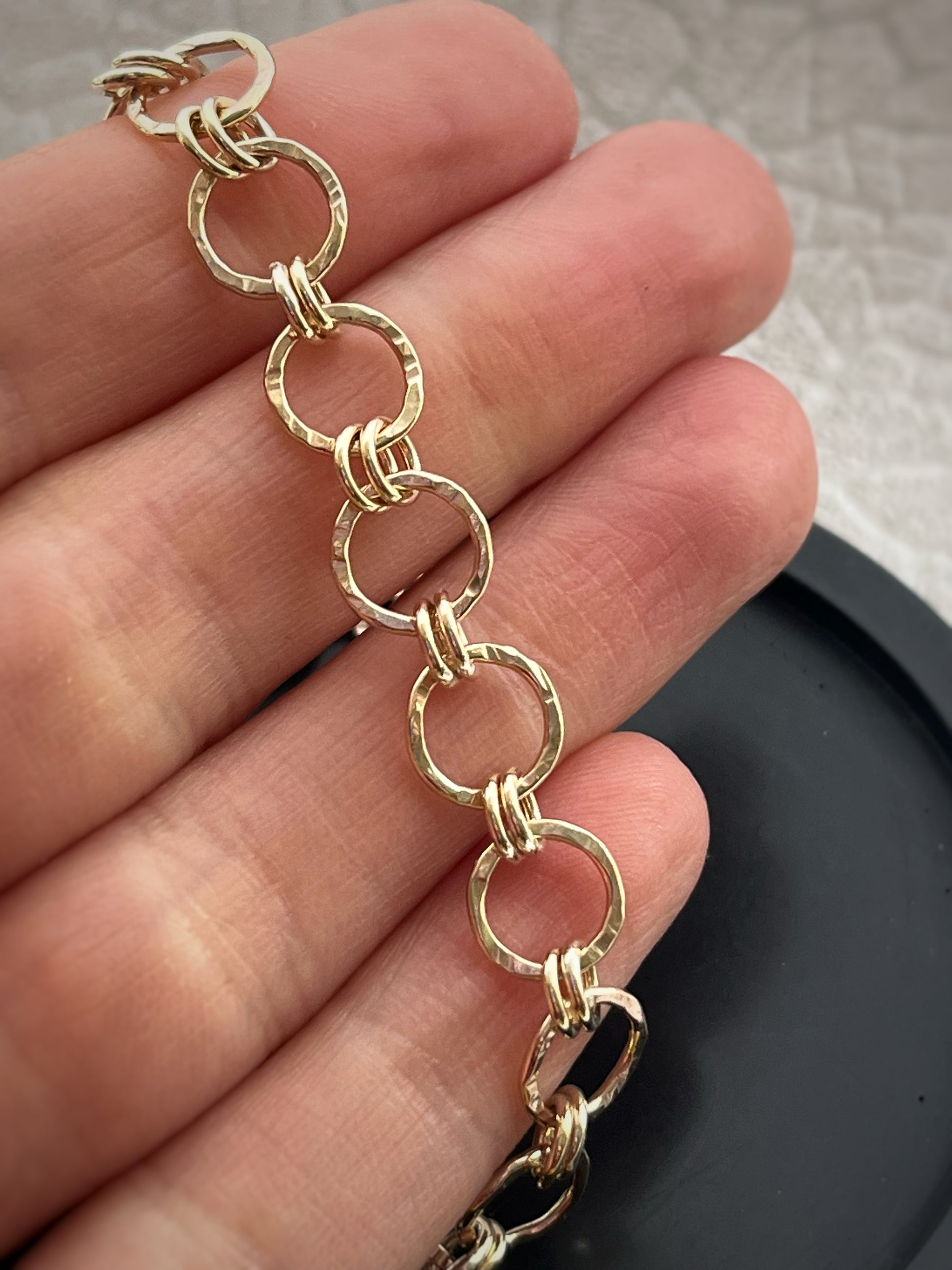 Solid gold interlocking circle bracelet, a handmade hammered textured 9ct solid gold hoop, round modern gold chain bracelet.