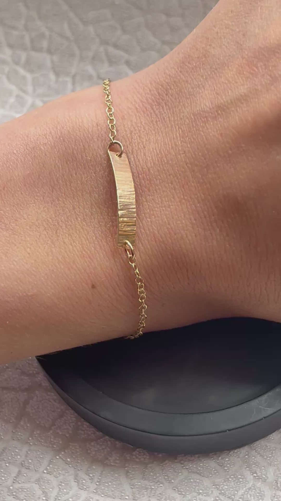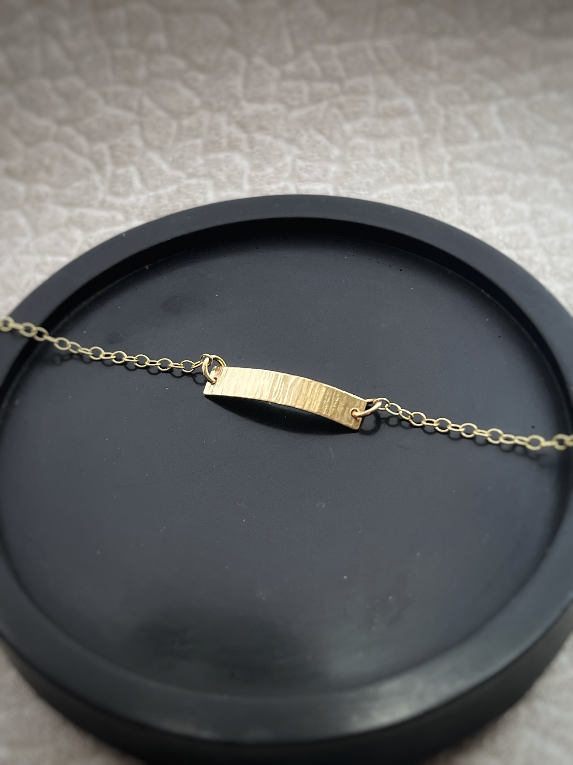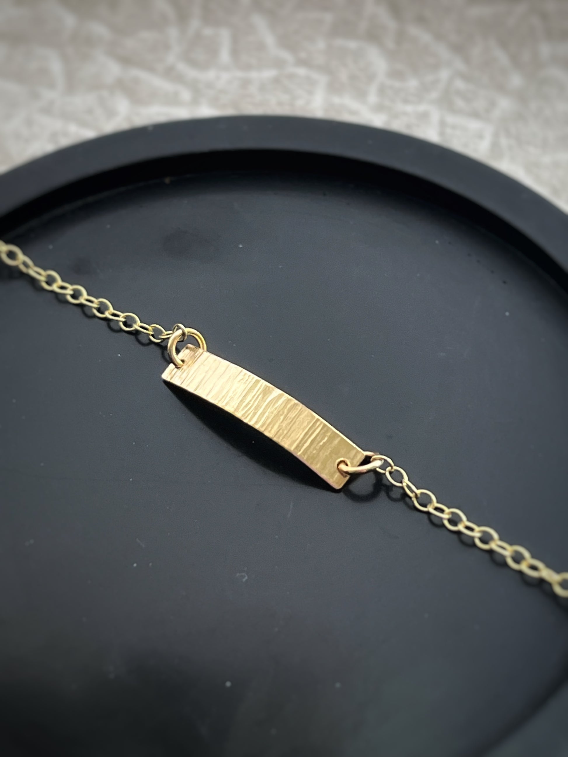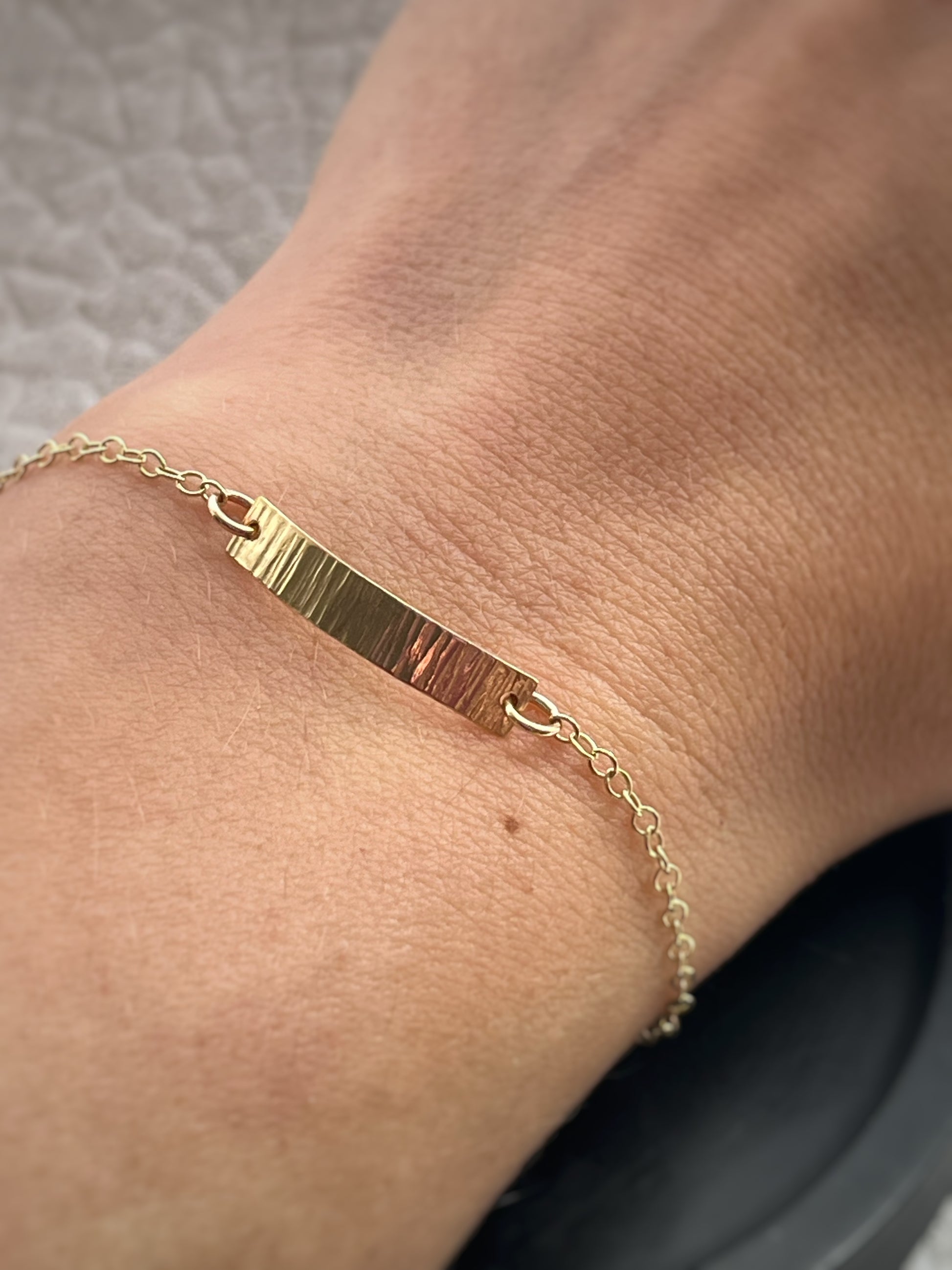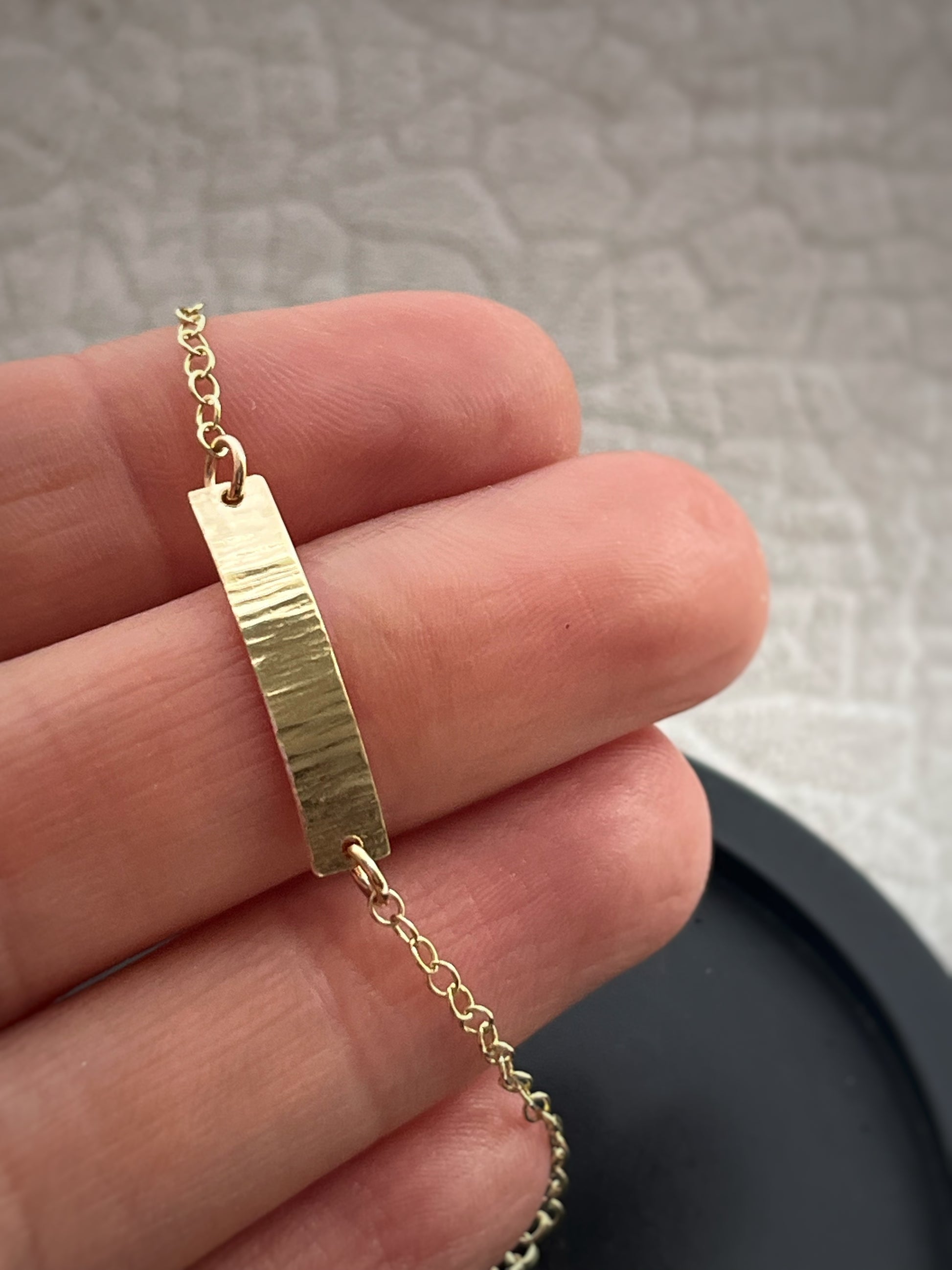 A simple and stunning modern hammered solid 9ct gold Simple bar chain bracelet hand made by me. I make very item by hand so each one is completely unique and one of a kind.