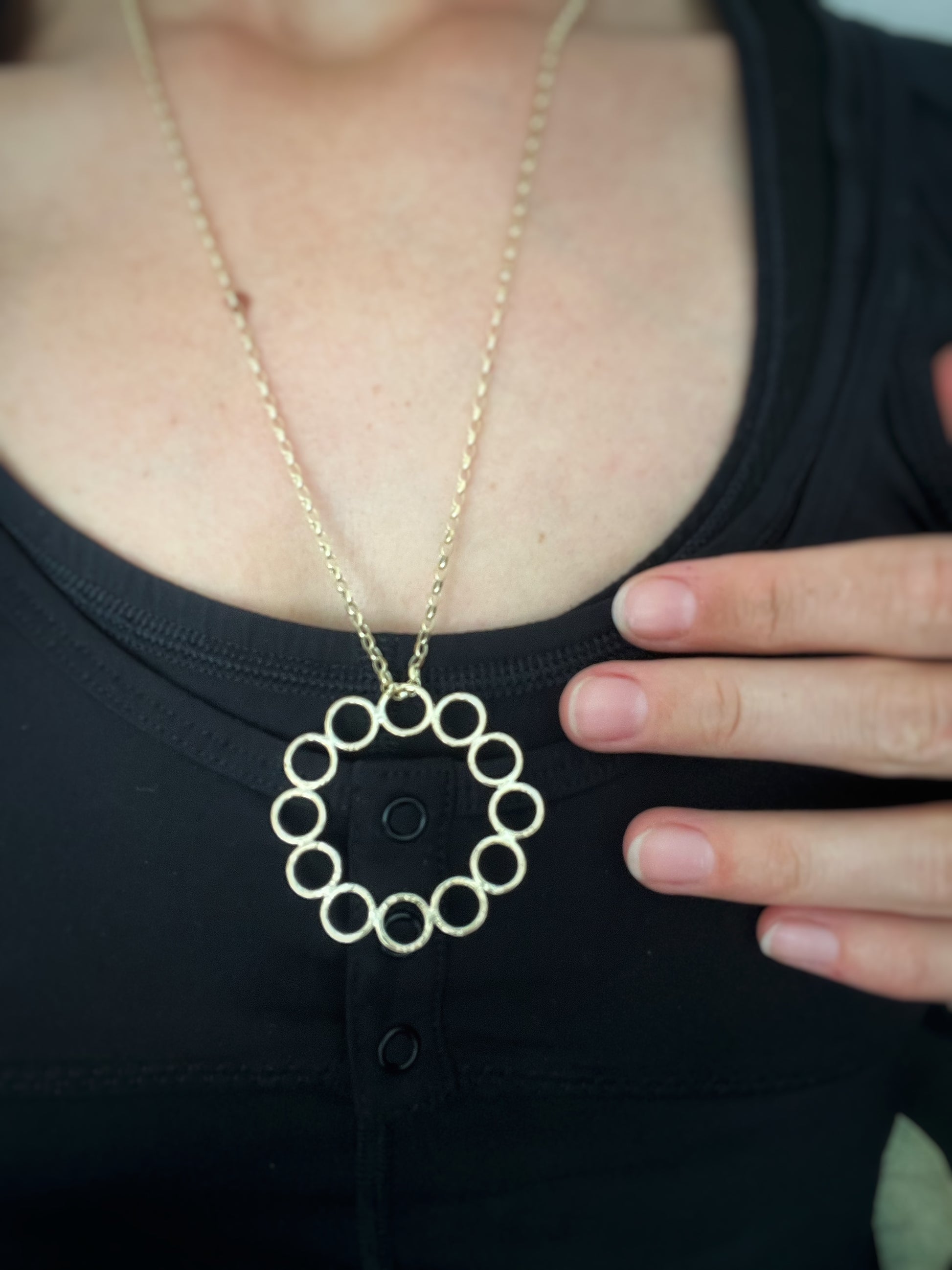 Solid 9ct gold 12 hoop statement circle pendant, a handmade hammered textured necklace