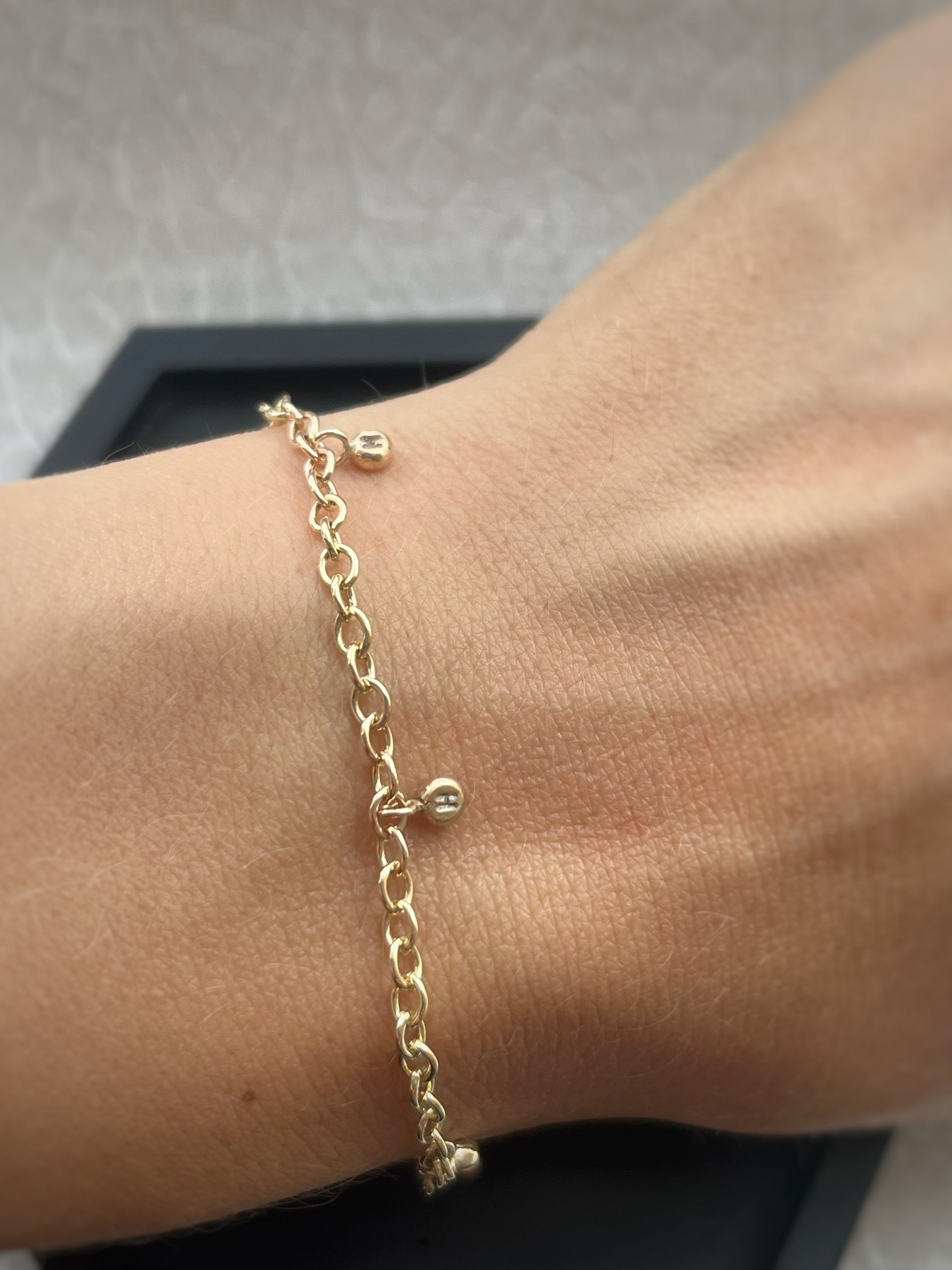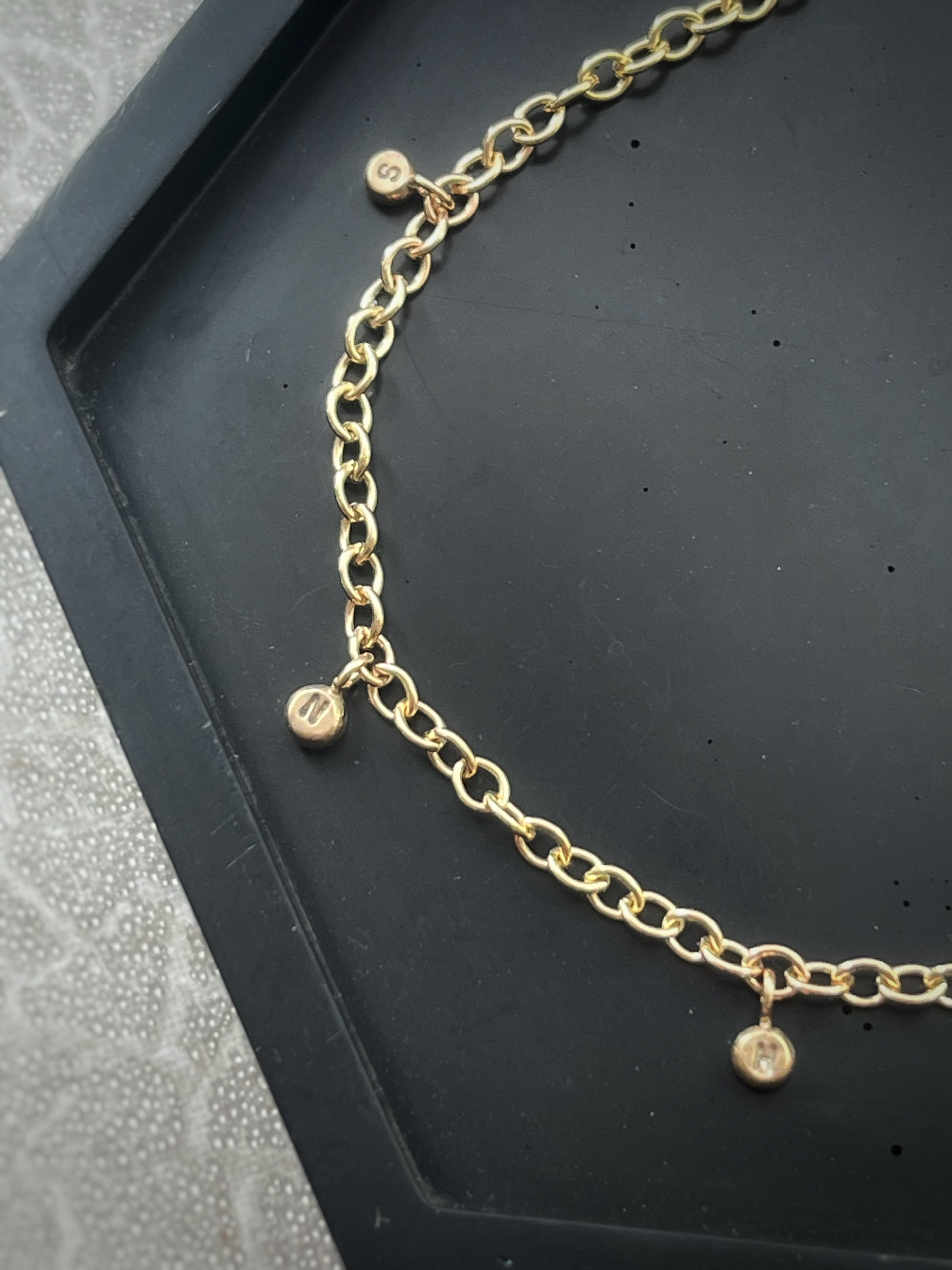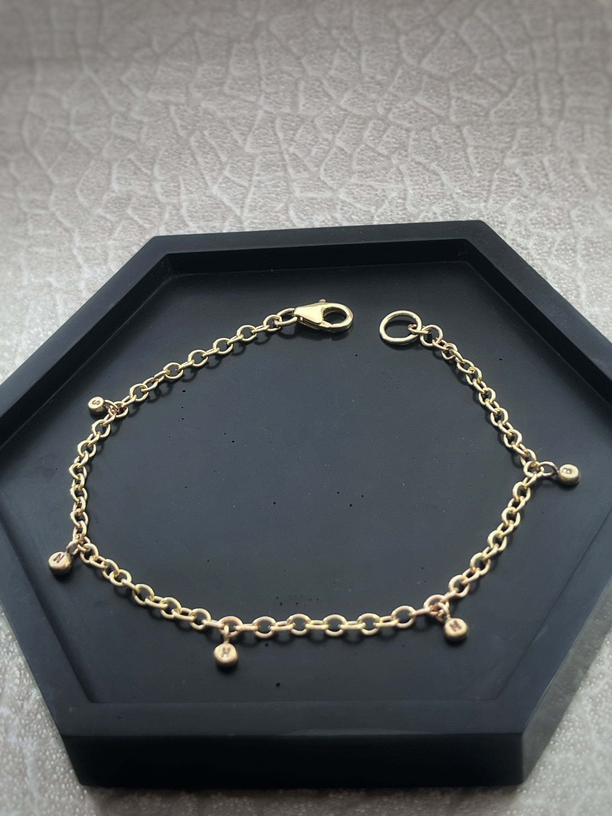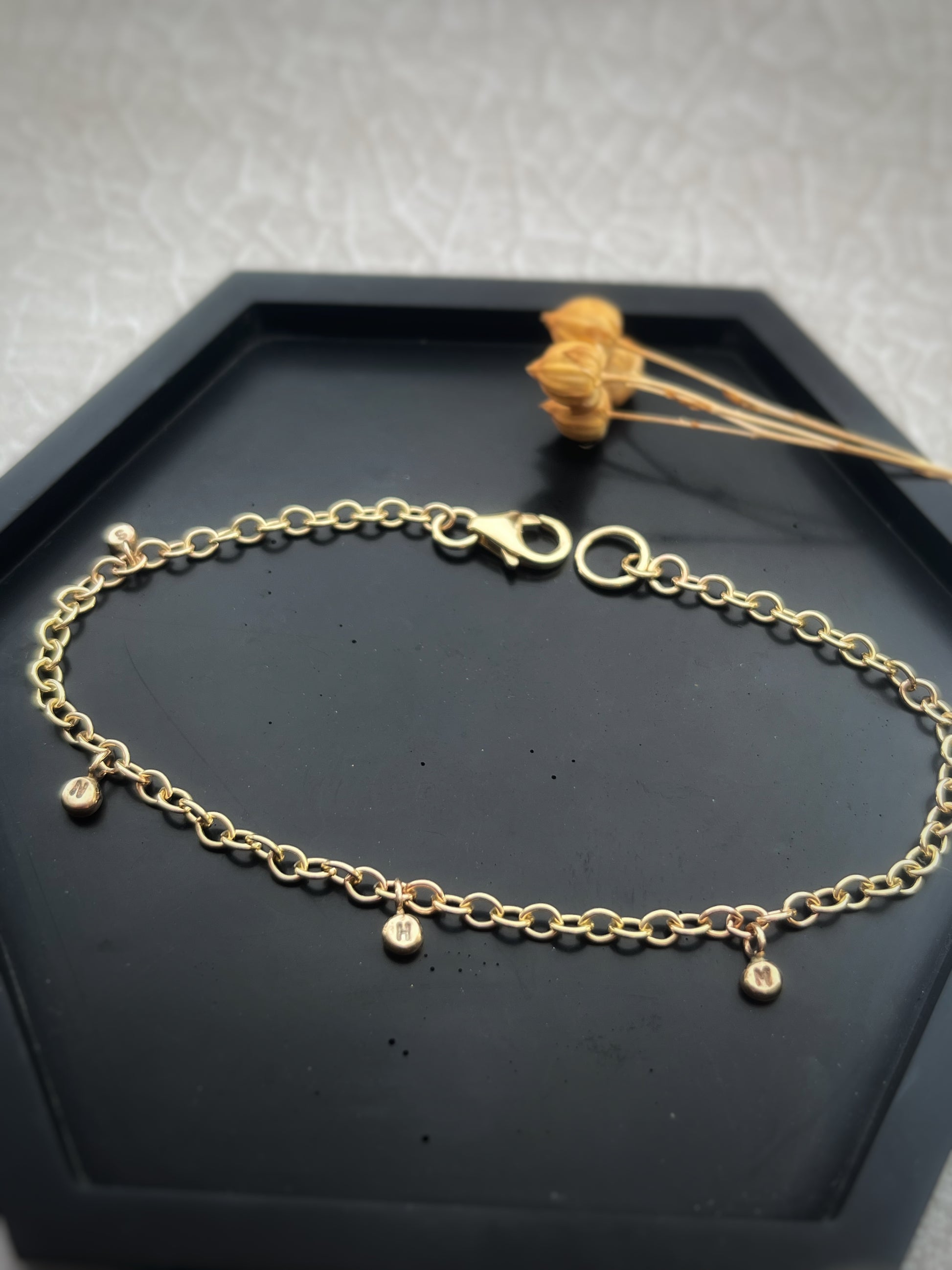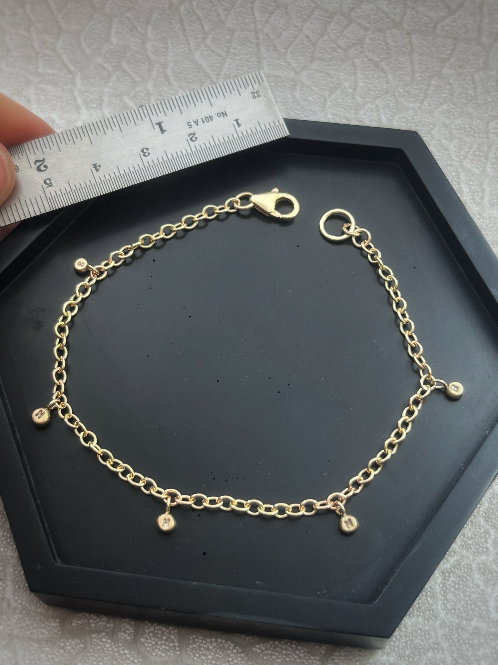Solid 9ct gold personalised 5 letter pebble charm bracelet, recycled initial handmade chain bracelet