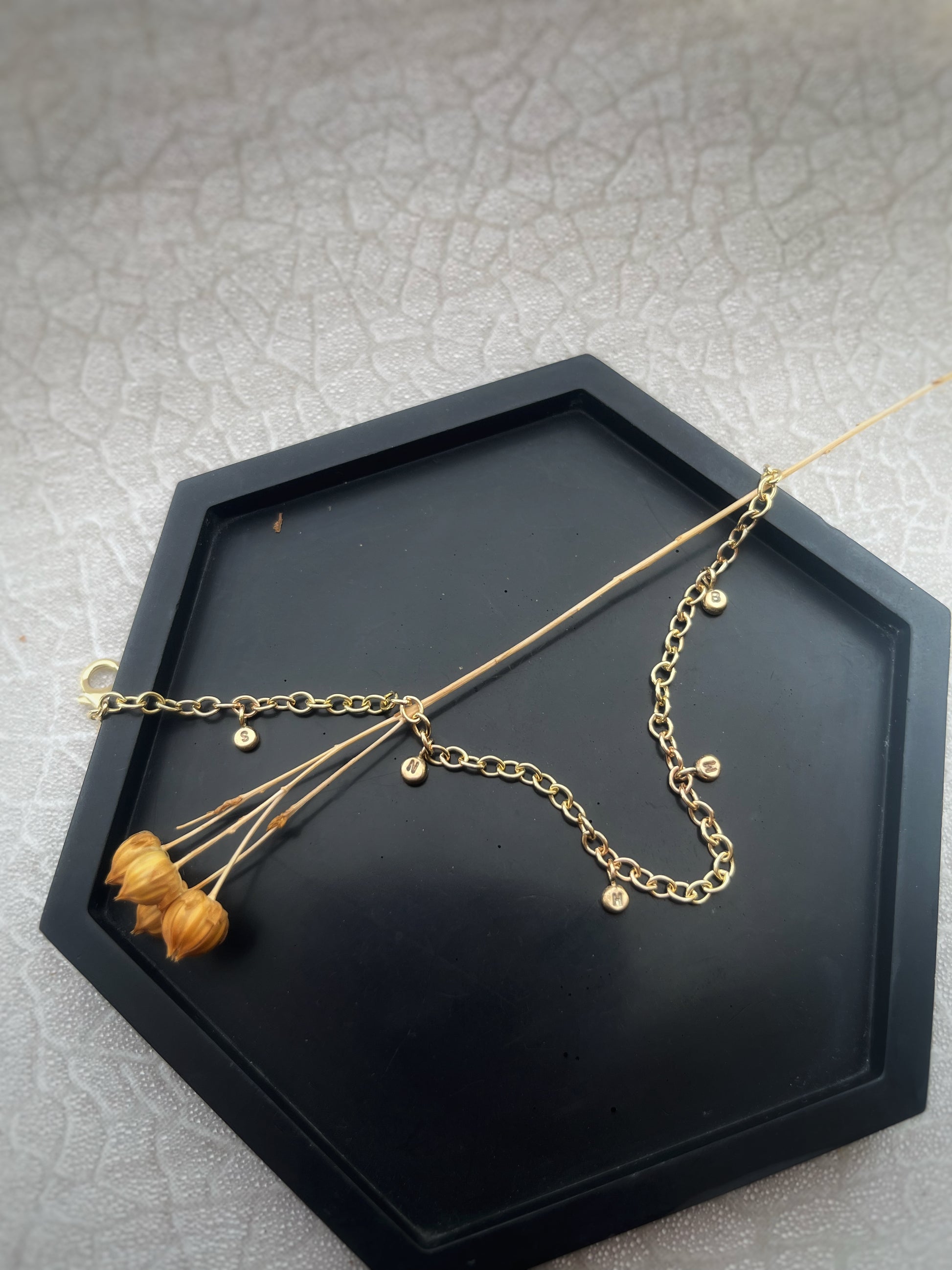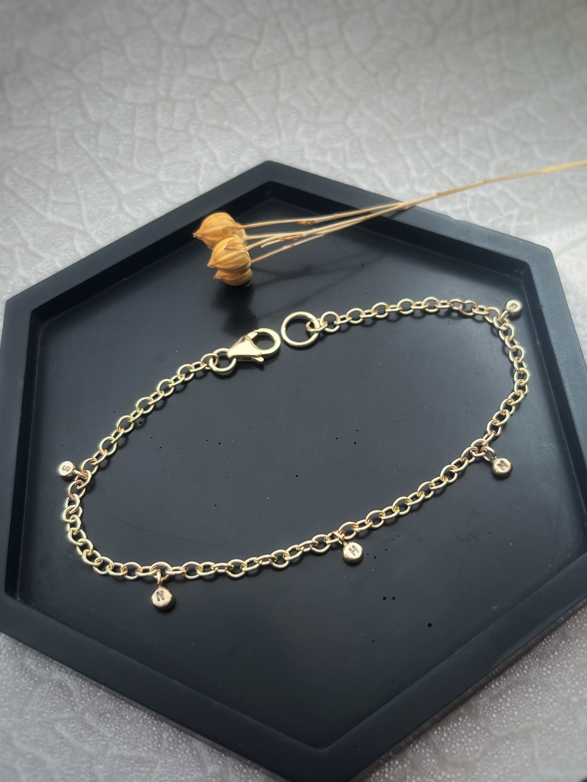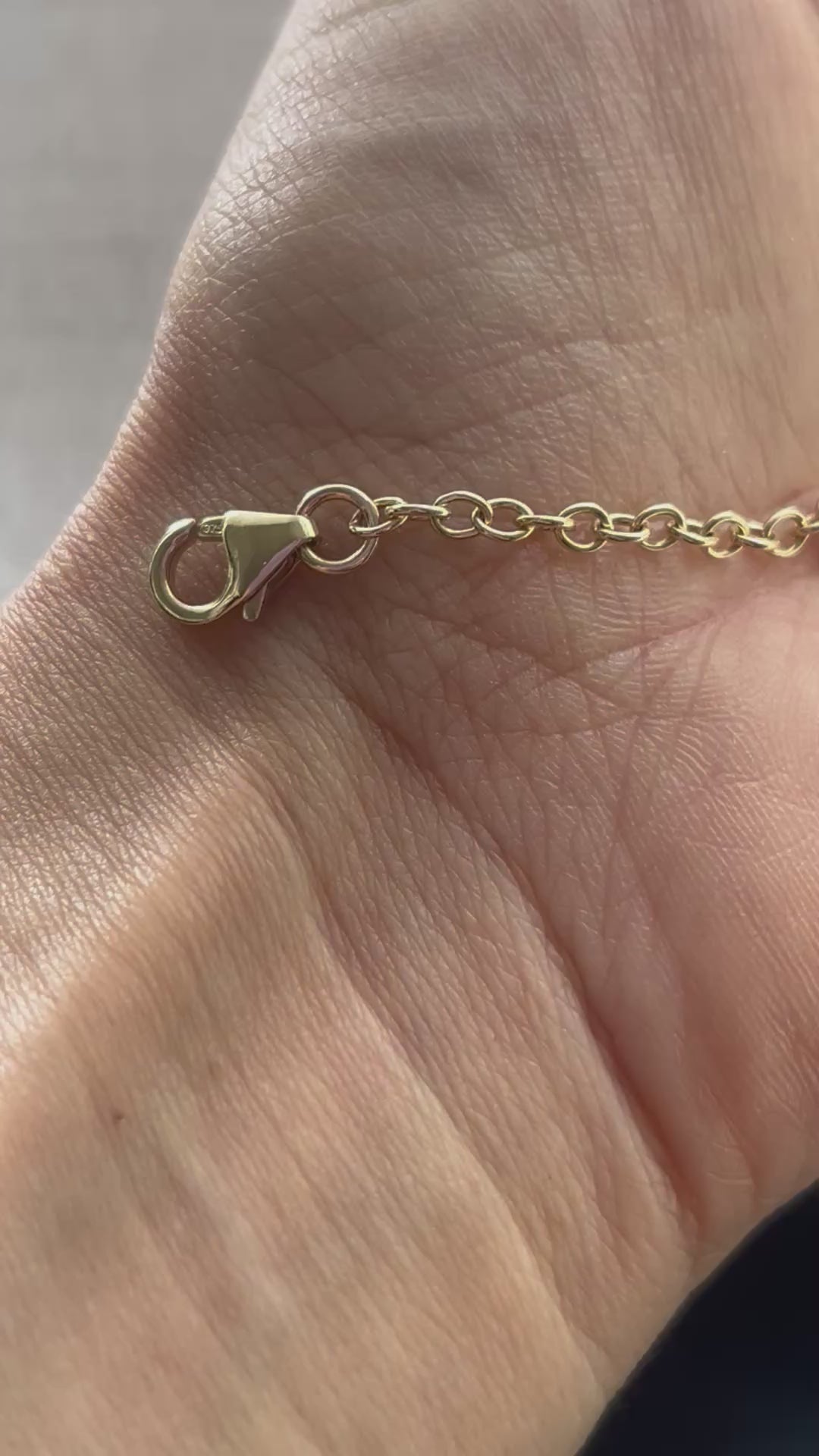 I hand stamp each 1mm letter onto each small pebble and attach them onto a solid gold chain. This is my modern take on the traditional charm bracelet. The solid 9ct trace chain bracelet has 2.5mm links and the trigger clasp is approximately 10mm.