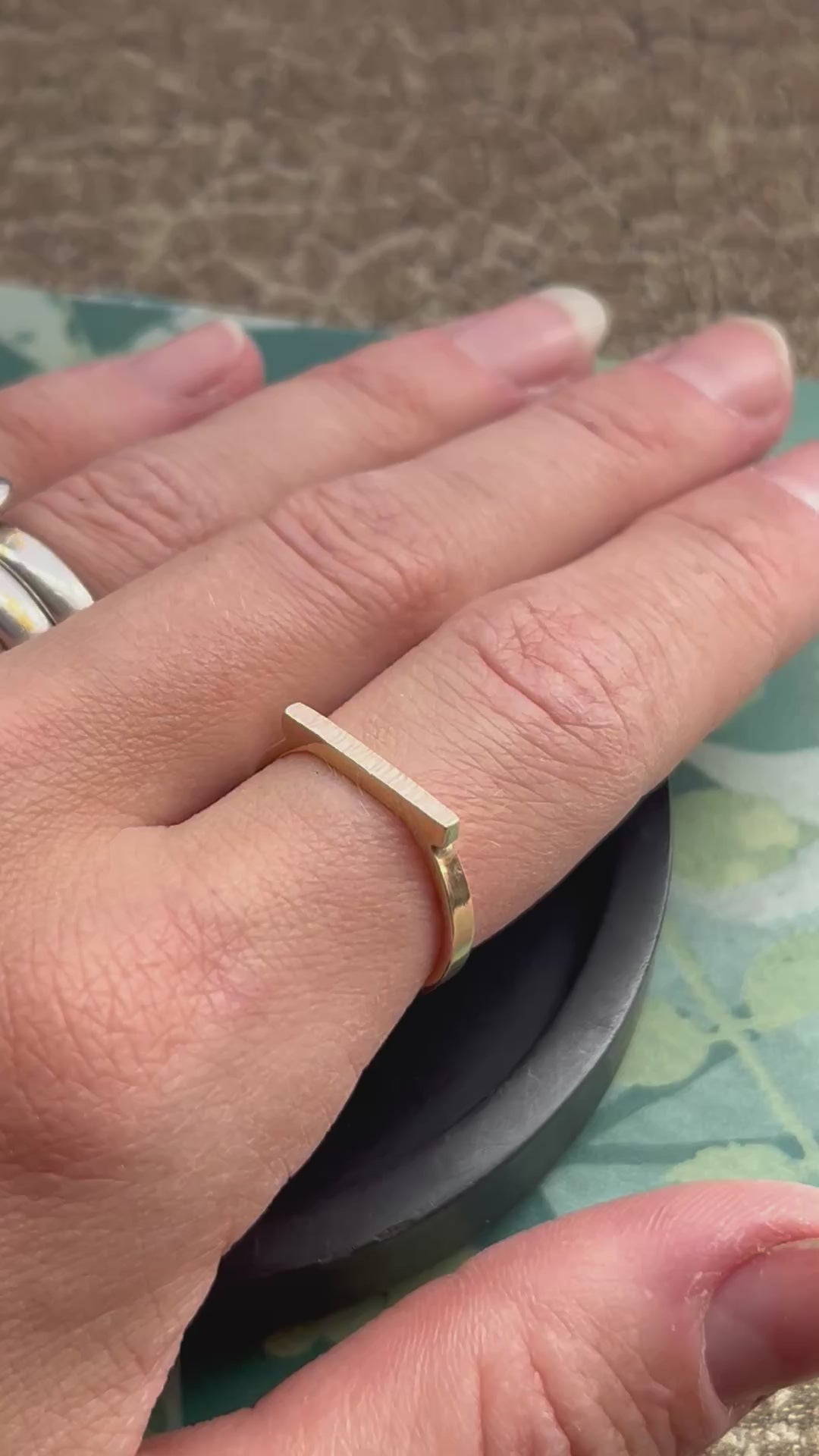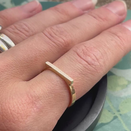 Solid 9ct yellow gold hammered bar ring 2mm wide, size N