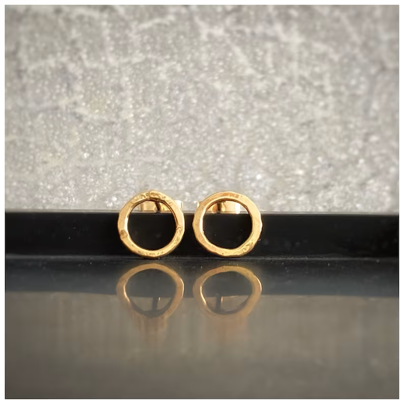 Tiny solid gold hammered circle earrings, small 9ct yellow gold round hoop bark textured studs, Simple geometric gold earrings
