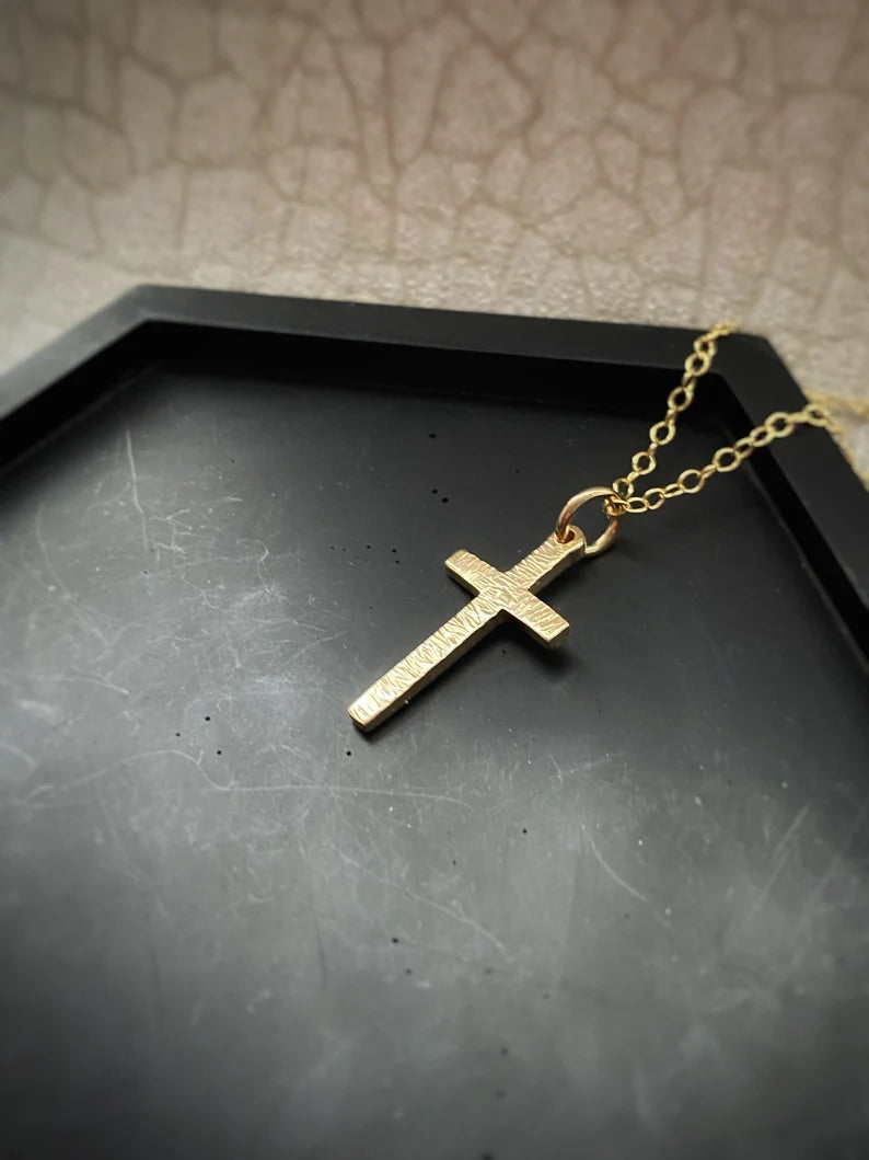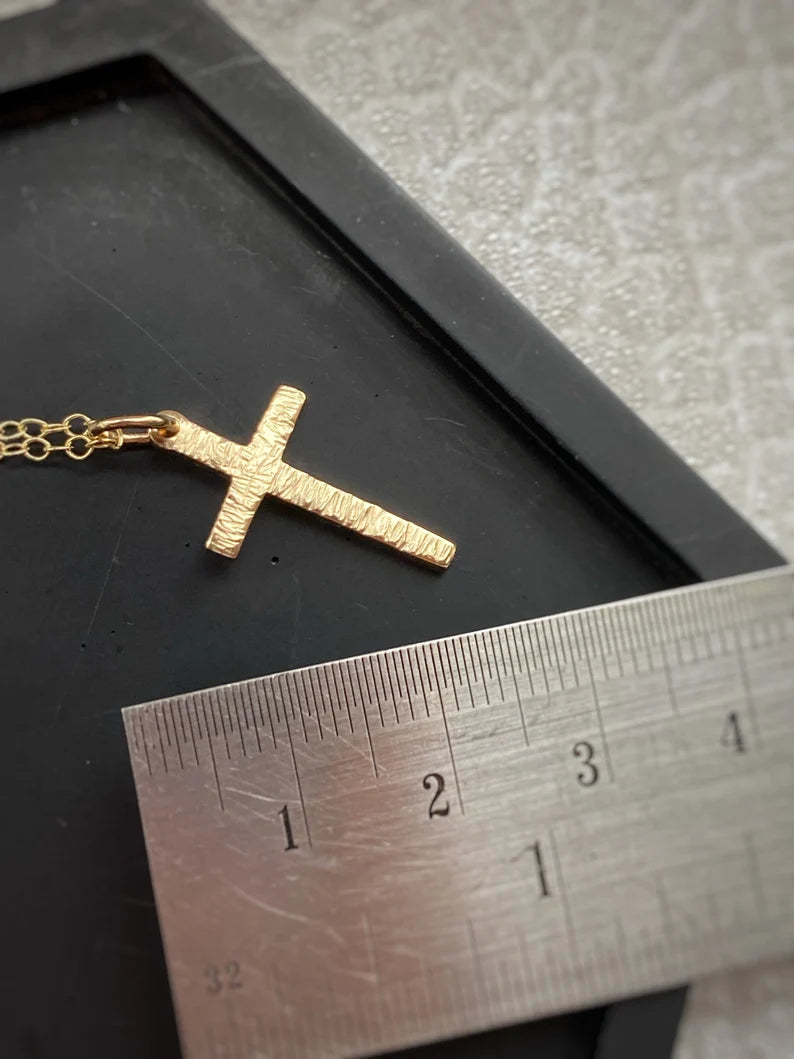 Solid 9ct gold hammered simple heavy cross pendant, handmade textured necklace