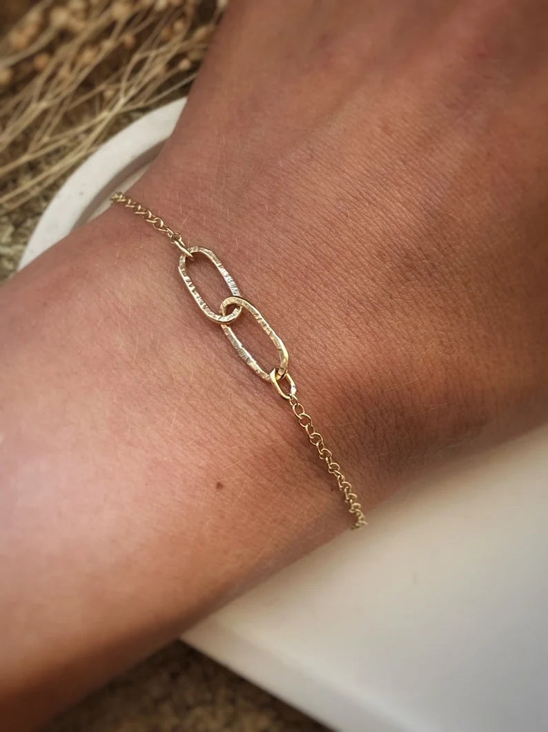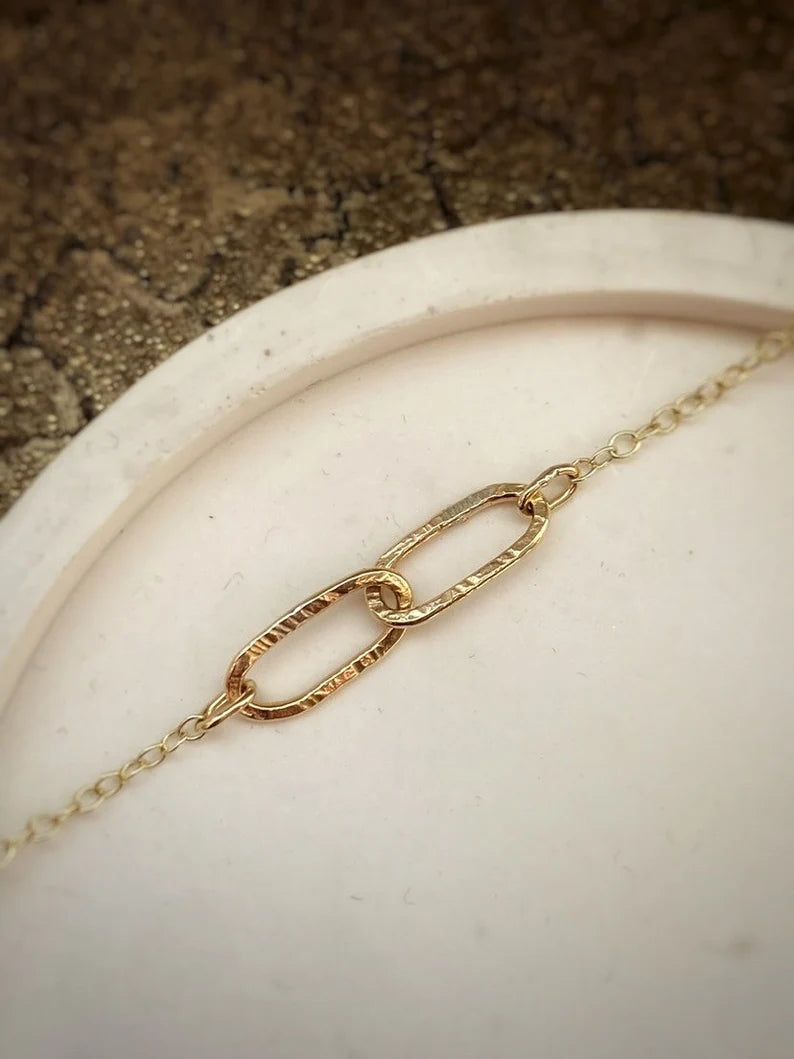 A simple and stunning modern hammered solid 9ct gold simple oval paper clip hoop chain bracelet hand made by me. I make very item by hand so each one is completely unique and one of a kind.