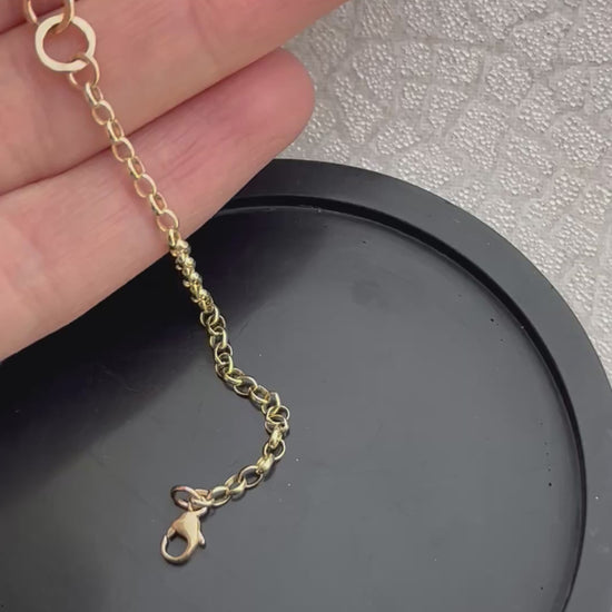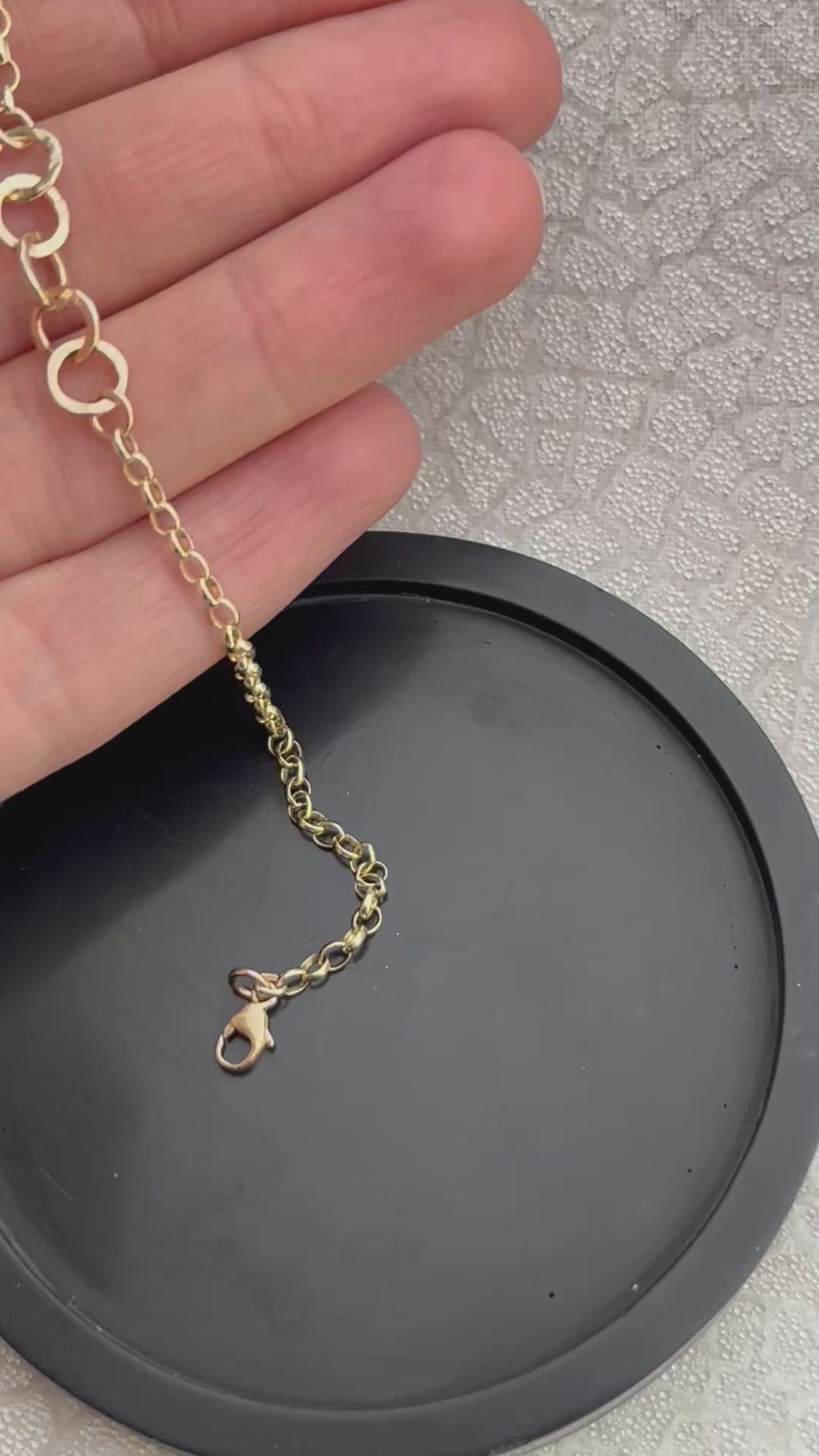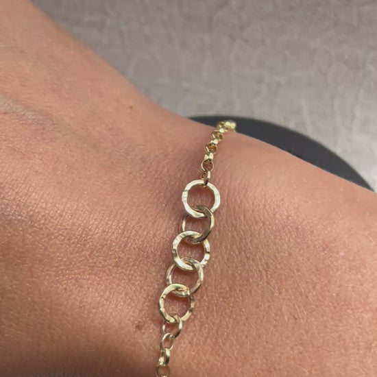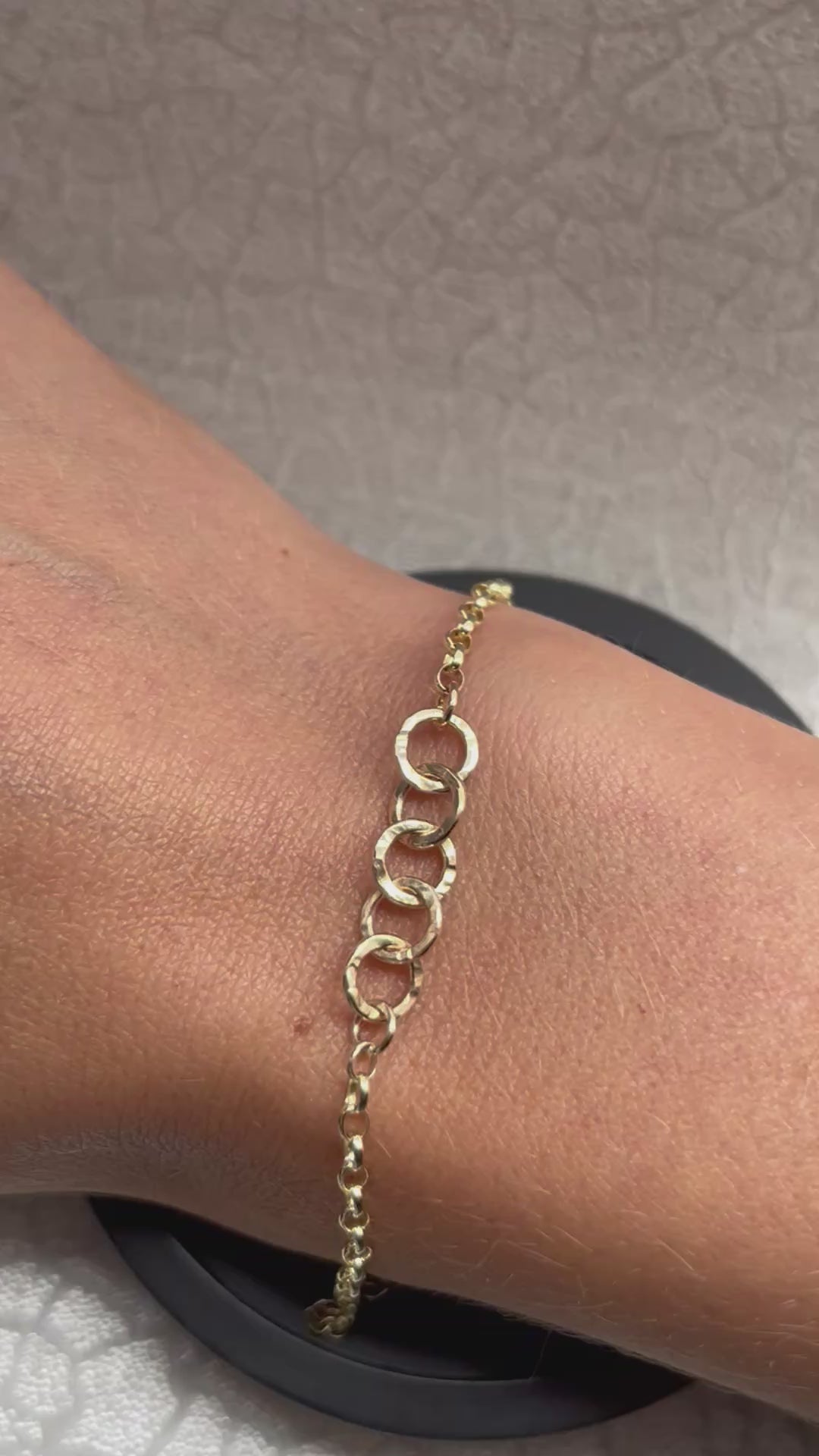 A simple and stunning modern hammered solid 9ct gold 5 simple circle hoop chain bracelet hand made by me. I make every item by hand so each one is completely unique and one of a kind.